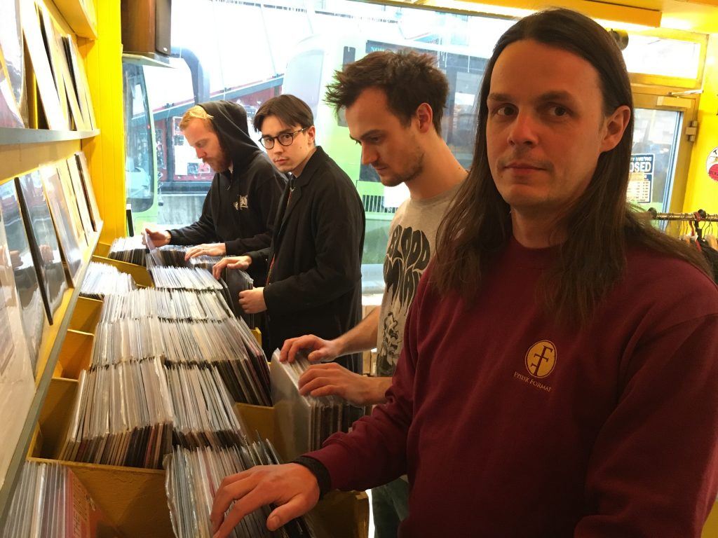 Fysiske formater (Til venstre): Urke Wik, Eivind Imingen, Jørn Haagestad og Kristian Kallevik i platebutikken de driver i Oslo. (Foto: Tellef Øgrim)