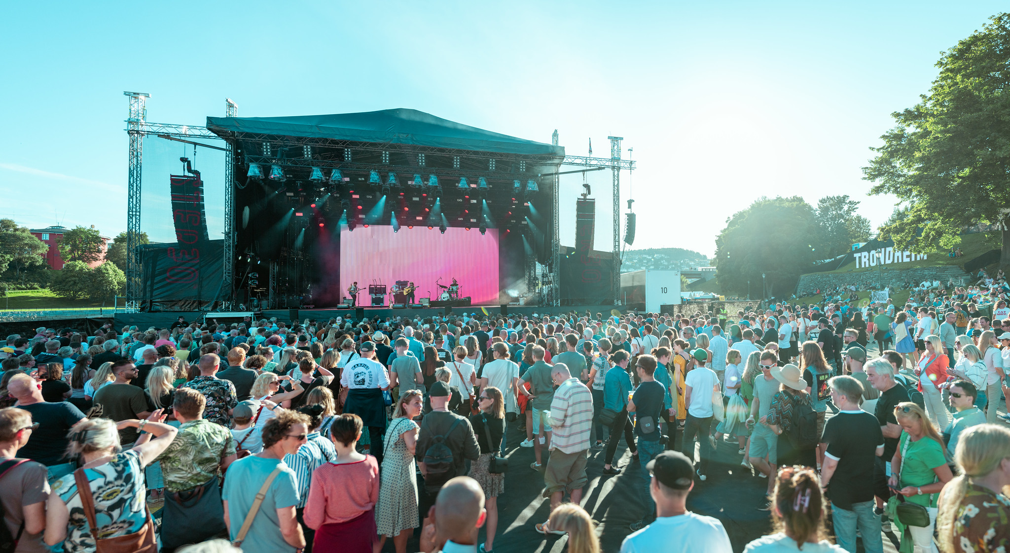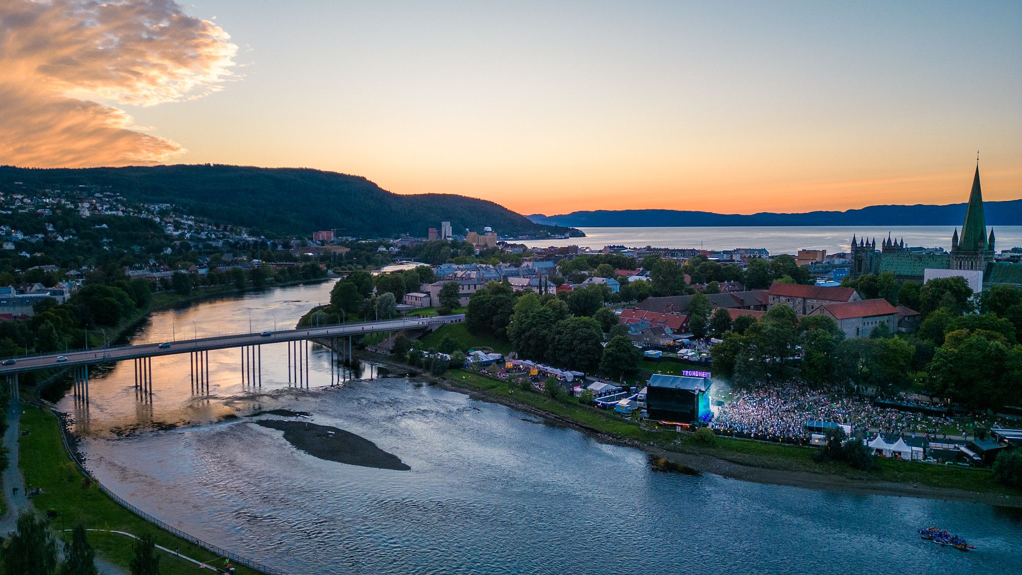 Pstereo-festivalen ligger vakkert til, ved Nidelva, Nidarosdomen og Festningen. (Foto: Trondheim kommunes droneenhet)