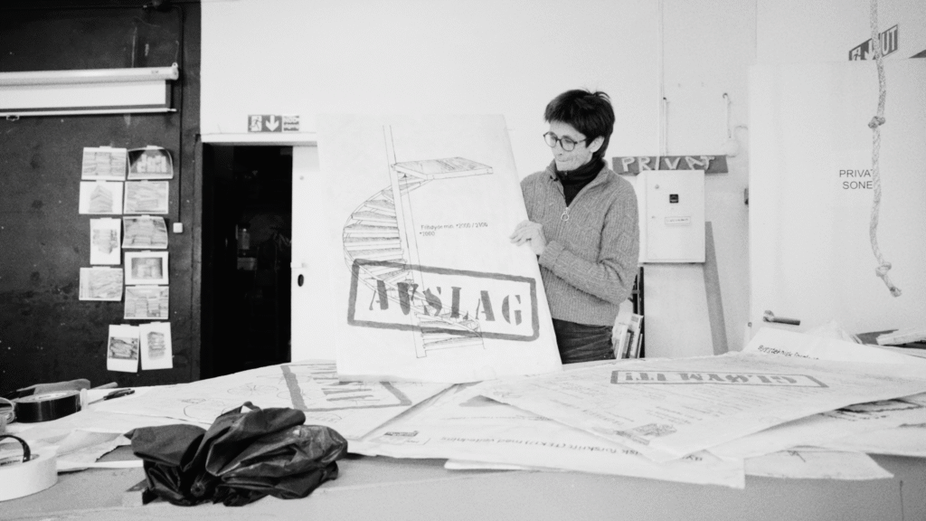 Anne Marit Sæther fra Cirka Teater viser frem rekvisitter fra forestillingen «Trappa». Her holder hun avslagsbrev fra kommunen som i forestillingen tar form som skjold. (Foto: Carl Christian Lein Størmer)