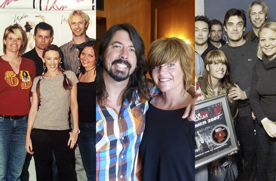 INGER OG STJERNENE: Inger Bråten med noen av de internasjonale stjernene hun jobbet med som promo-ansvarlig – Kylie Minogue, Dave Grohl og Robbie Williams. (Foto: Privat / EMI)