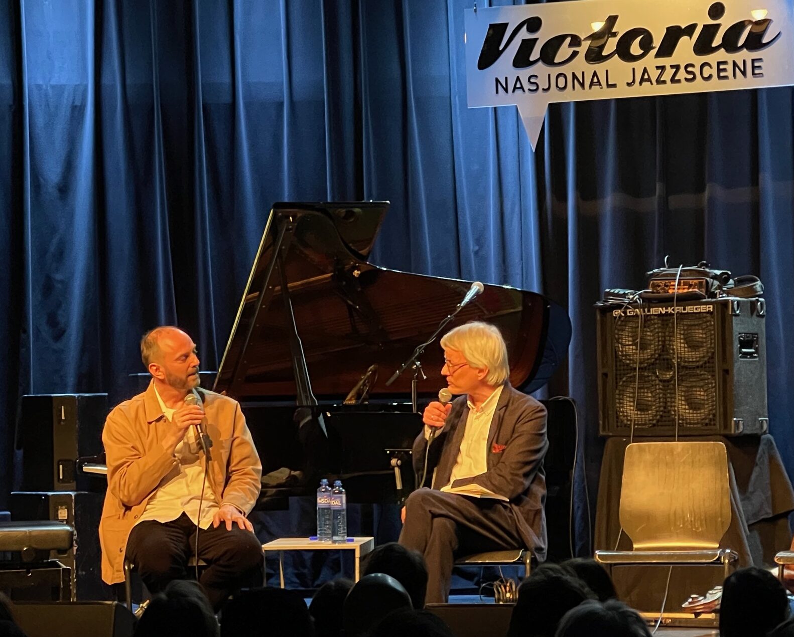 Audun Vinger i samtale med Håvard Bråthen om dokumentarserien «Jazzeventyret» på NRK. Vinger til høyre. (Foto: Guro Kleveland / Ballade)