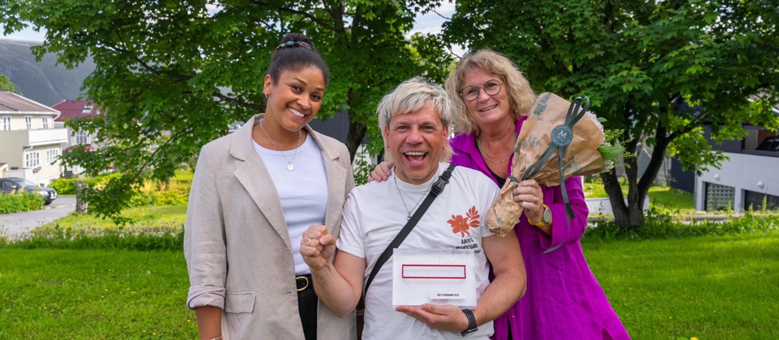 Tromsø World ble utropt til Årets nykommer 2023. Her ser vi Vasil Gjuroski, festivalsjef og daglig leder i Tromsø World, flankert av arbeidende styreleder i Tromsø World, Nora Kiil (til høyre) og Nyaling Saidy Kiil fra Norske Kulturarrangører. (Foto: Norske Kulturarrangører)