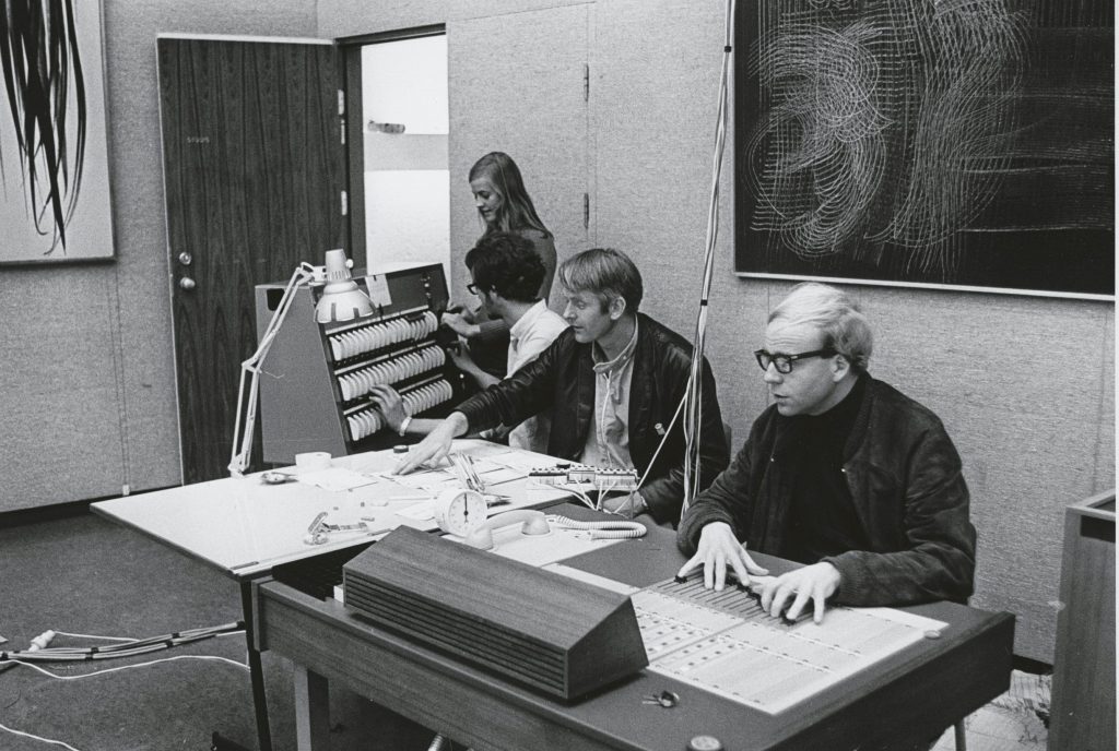 Wenche Øyen, Terje Øyen, Eyvind Moe og Arne Nordheim arbeider sammen om Nordheims Solitaire for, og i, Henie Onstads lokaler. (Foto: Henie Onstad arkiv)