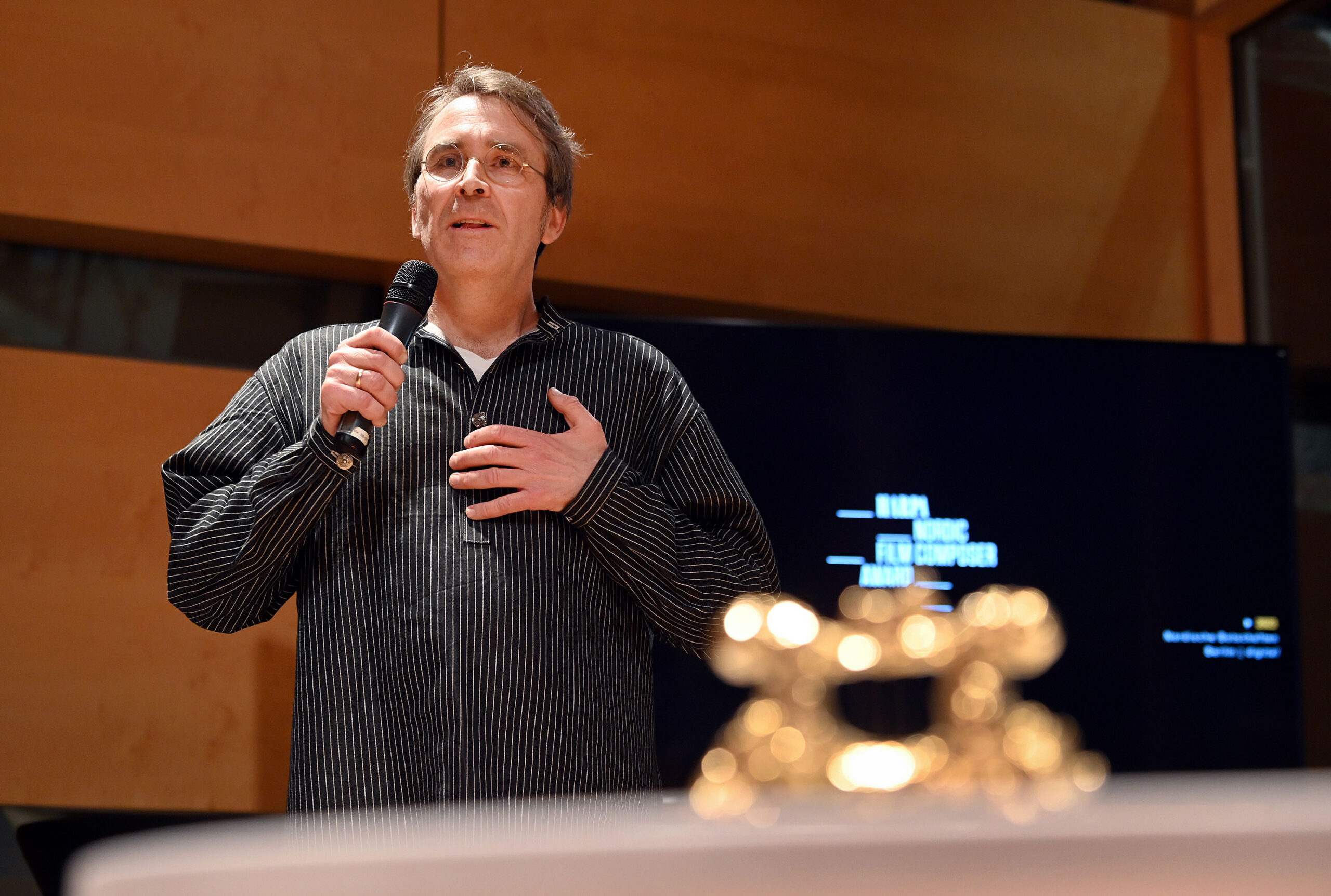 Jørund Fluge Samuelsen med Harpa-prisen. Statuetten er designet av den islandske kunstneren Ragnar Kjartansson. (Foto: Thomas Kolbein Bjørk Olsen, Berlinkontoret)