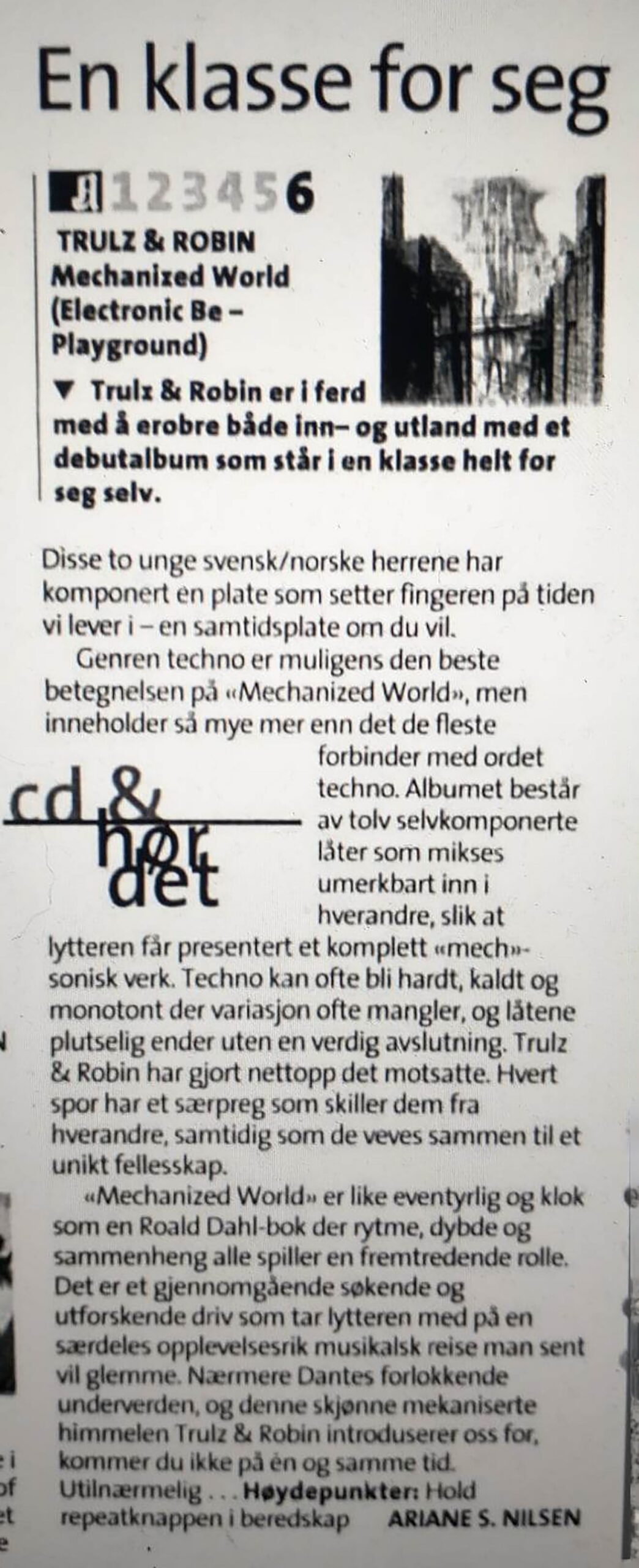 CD & HØR DET: Fra ei tid da fortsatt CDer (med varierende lydkvalitet) var standarden. Ariane S. Nilsen ga Trulz & Robin en sekser i Aftenposten. Dagbladet kalte plata «vakker og jagende techno». For deres neste album (2003) fikk de en sekser av VG. (Foto: faksimile Aftenposten)