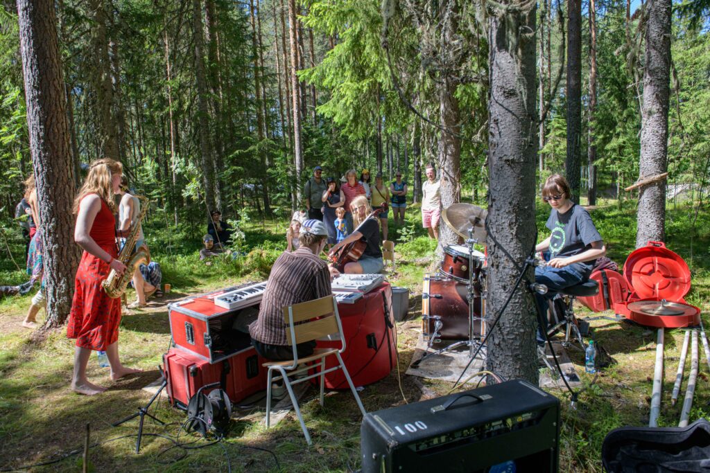 Til middag så var det ein lokal bonde som hadde plukka ramslauk og mekka belgisk vaffel med storfekjøt og ramslaukspesto. Rare, og megagode greier! Menyen var så godt som eg kunne sjå sterkt lokalt forankra – også med lokalbrygga øl frå Numedal Stasjon Bryggeri. Eg traska gjennom skogen med vaffelen, og støtte på ein konsert på vegen. Gjennom heile festivalhelga oppstod det nemleg også små, tilsynelatande spontane, konsertar som ikkje stod i programmet. Kanskje kan alle spele her?