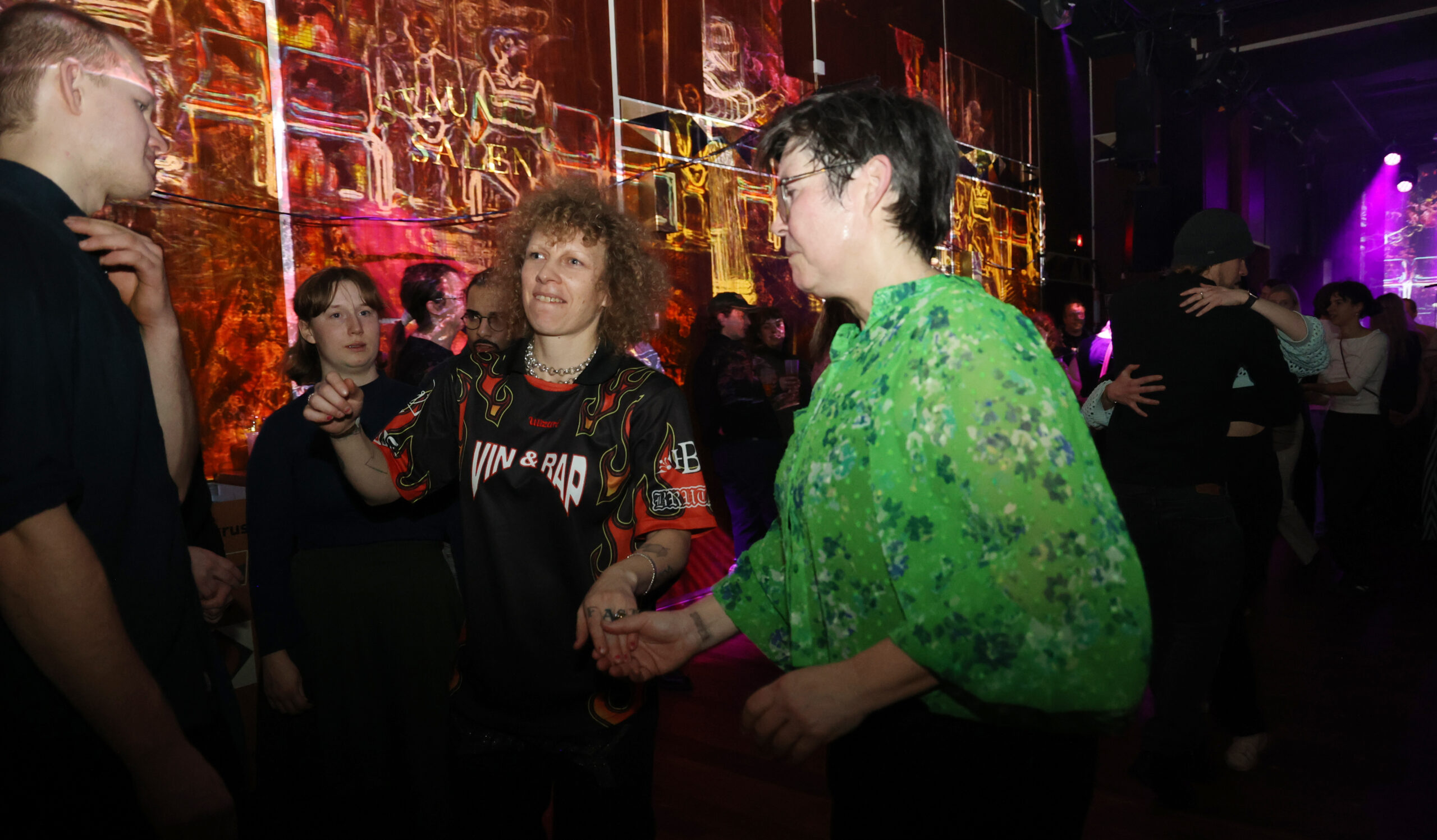 Turleiar Lene Furuli frå OsloFolk (i grønt) var strålande nøgd med helga. Her i dans under Tuvas Blodklubb i København med direktøren på Riksscenen, Ane Carmen Roggen. (Foto: Knut Utler)