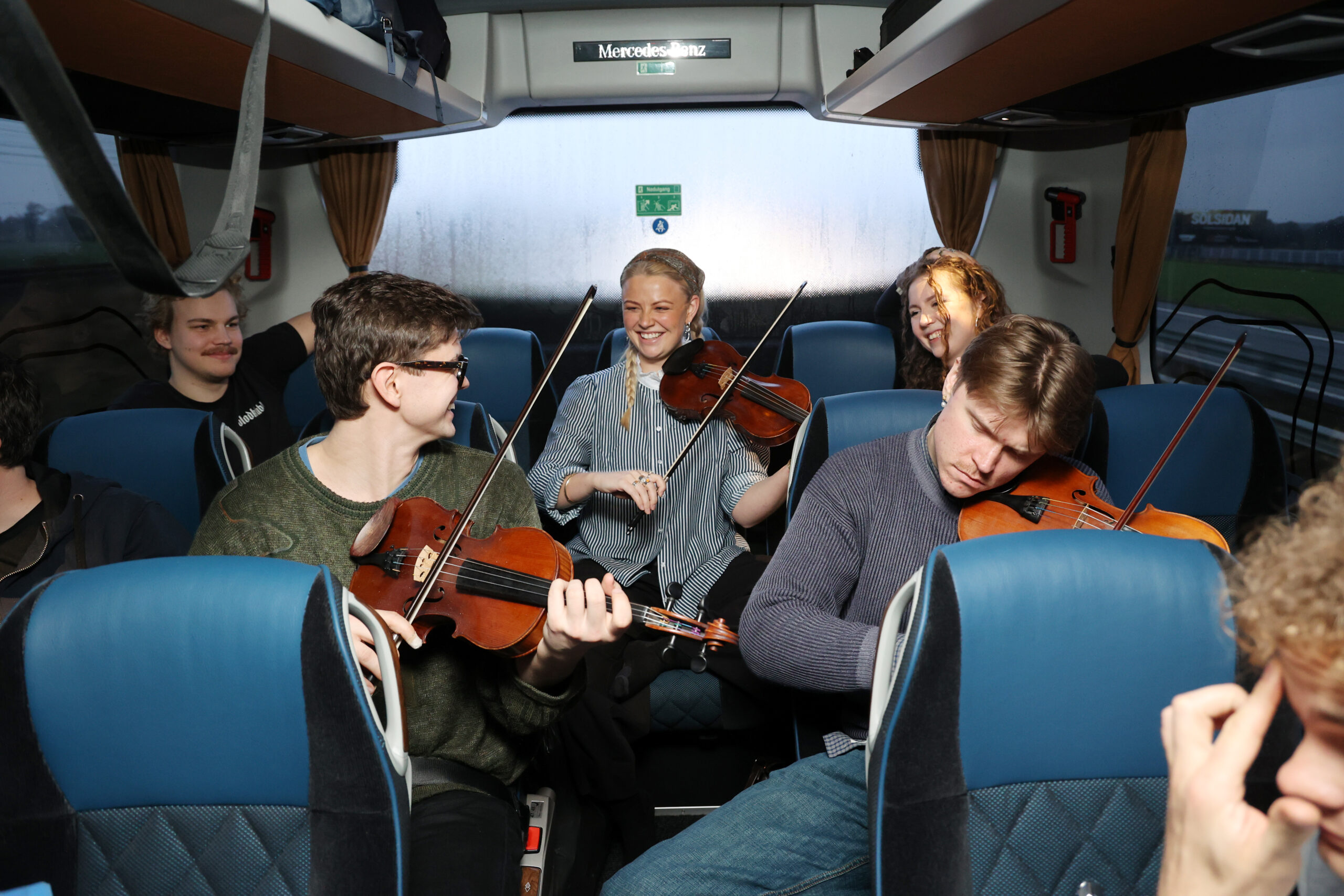 På bussen var det ei brokete forsamling med folk. Me har alt frå røynde kappleiksgjengarar til folk som berre så vidt har gløtta inn i klesskåpet til folkemusikkens forunderlege verd. Her er i hovudsak unge studentar, men også folk i «sin beste alder». Dei fleste som er med er busett i Oslo for tida, men kjem gjerne frå ulike stader i landet.