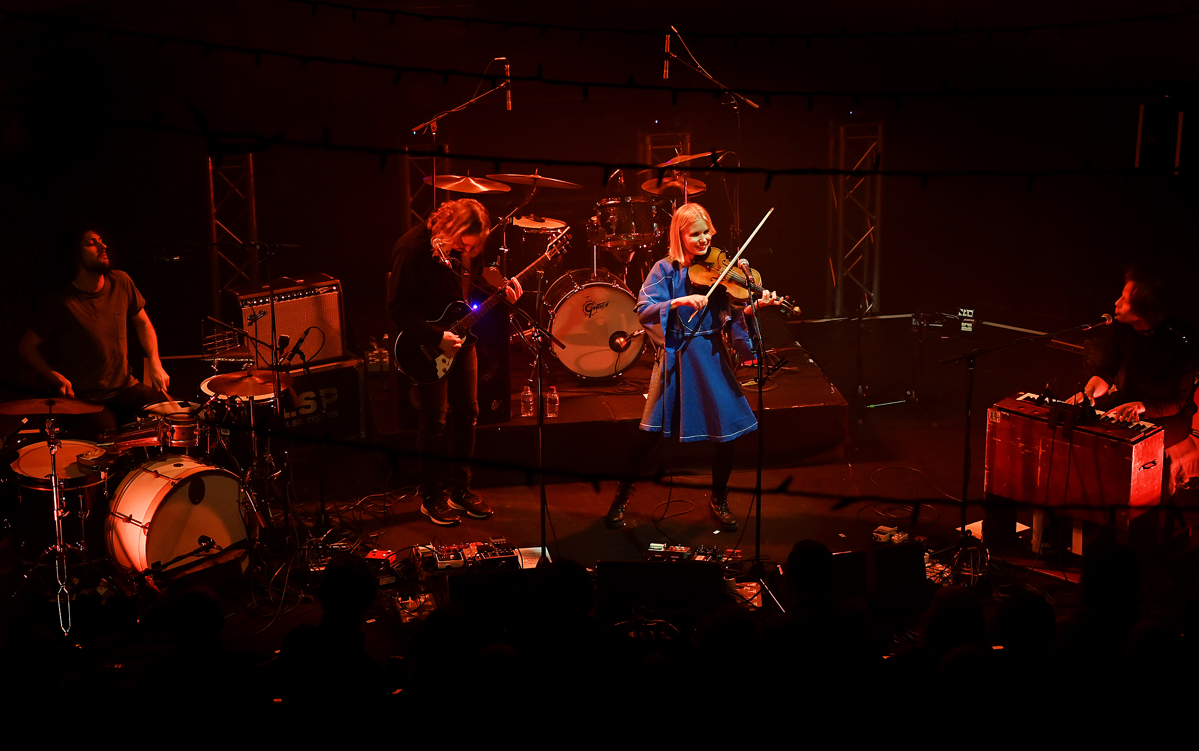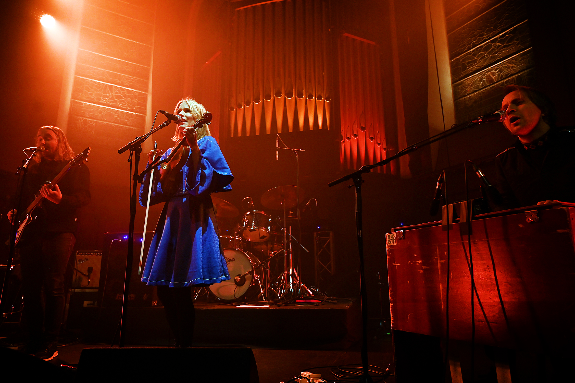 JULIE ALAPNES OG BANDET: Alapnes har med seg Petter Carlsen på barytongitar og vokal, Halvard Rundberg på trøorgel og gitarer, og Aleksander Kostopoulos på trommer. Her fra konserten på St. Luke’s i Glasgow. (Foto: Thomas Kolbein Bjørk Olsen, Berlinkontoret)