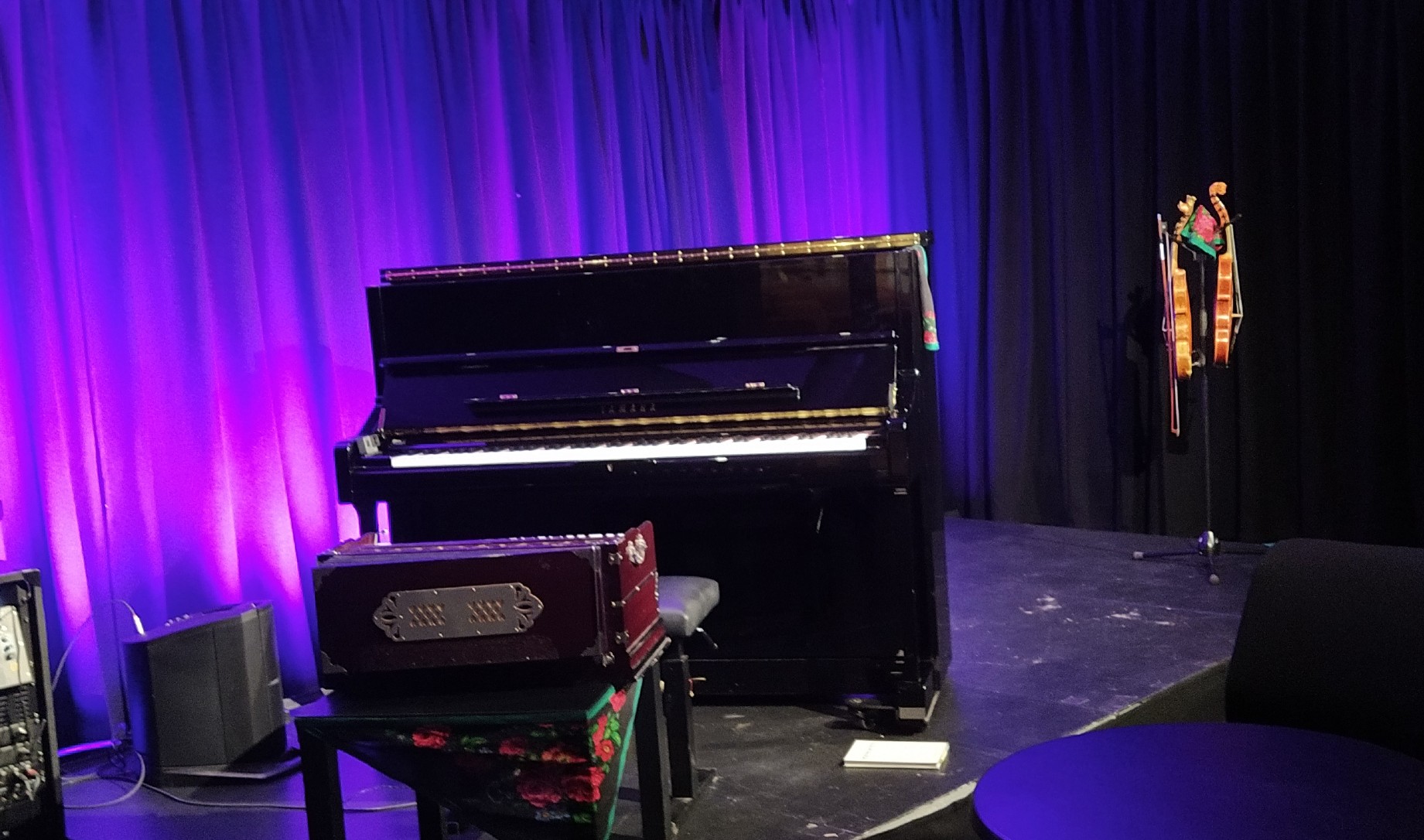 To hardingfeler på stativ, ståpiano og et, hva heter det instrumentet igjen, pumpeorgel, harmonium, ja. Cirka 50 middelaldrende publikummere, jeg sitter bakerst. Forbi meg kommer lydteknikeren, demper lyset på en vanlig ELKO-bryter, og ignorerer miksebordet.