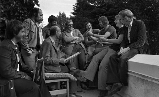 Festivalstyret 1975. Fra v: Bjørn Nilsen, Frode Lund, Tore Strande, Arve Hanssen, Arne Lillevik, Petter Pettersson, Ole Torbjørn Farstad, Bjørn Friisvold, Knut Talstad og Kikkan Sættem jr.