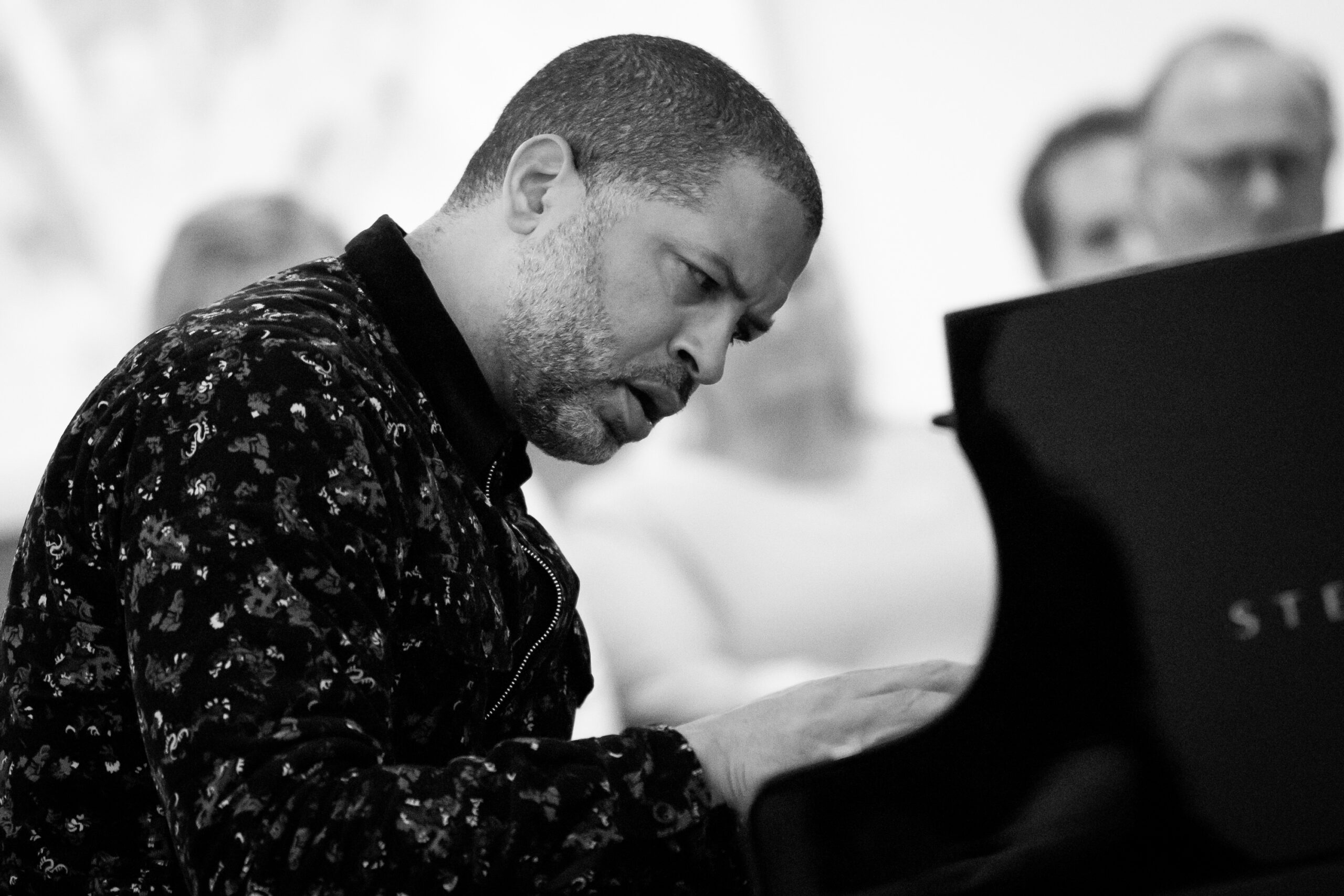 Men dette er ikkje berre Jason Moran si forteneste. Nokon har tenkt tanken – Jason Moran solo i monumentalsalen, klokka ti på kvelden. Publikum sit rundt det akustiske flygelet, tett inn på. Det blir ei oppleving, ikkje berre ein konsert.