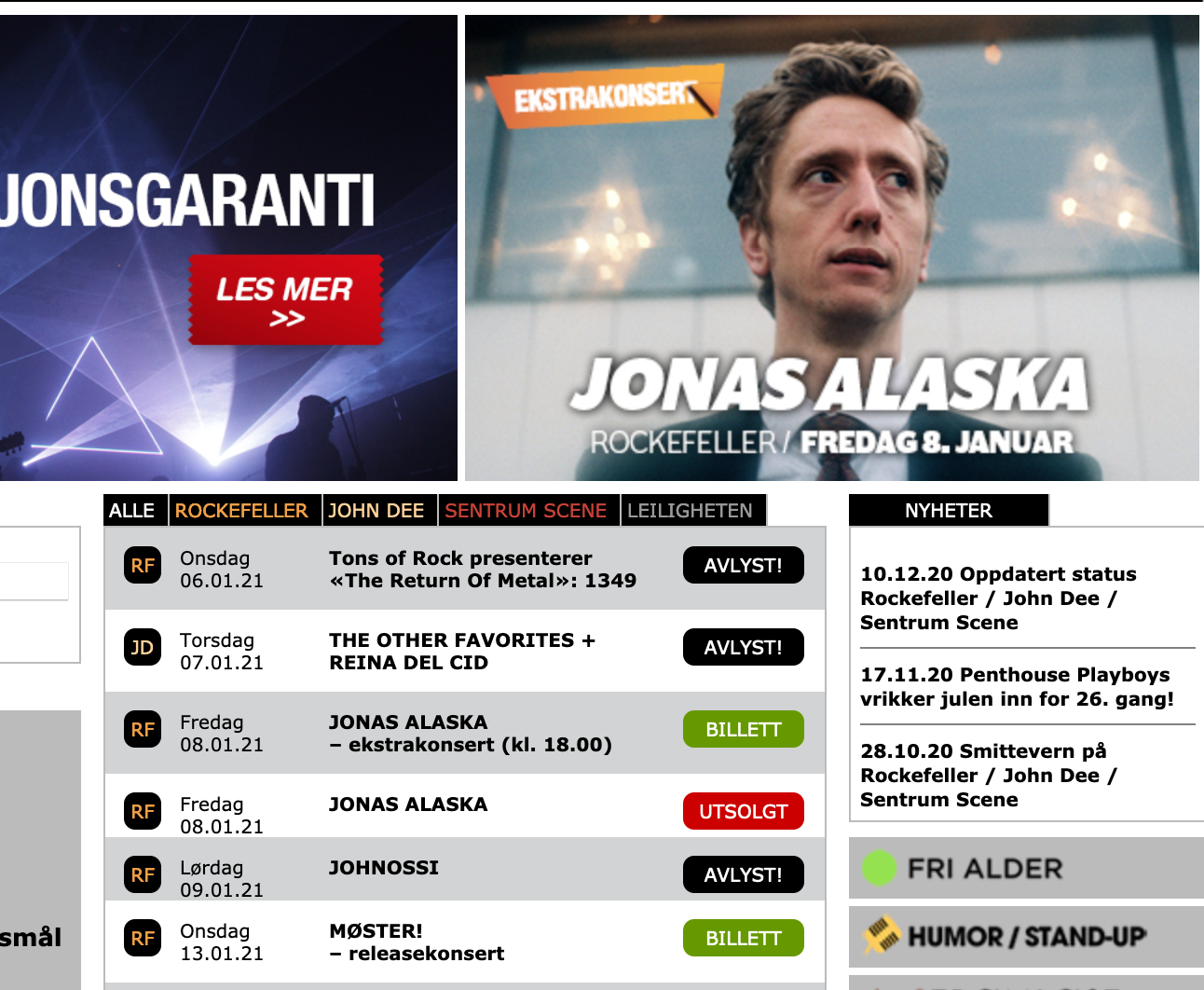 Faksimile fra Rockefeller, Sentrum Scenen mfl sin nettside med tilgjengelige og avlyste arrangement (Foto: rockfeller.no)