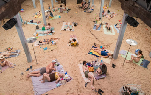 «Sun & Sea» er ein operaperformance av Rugilė Barzdžiukaitė, Vaiva Grainytė og Lina Lapelytė, som blandar musikk, teater og visuell kunst saman med cirka 20 tonn sand (Foto: Andrej Vasilenko)
