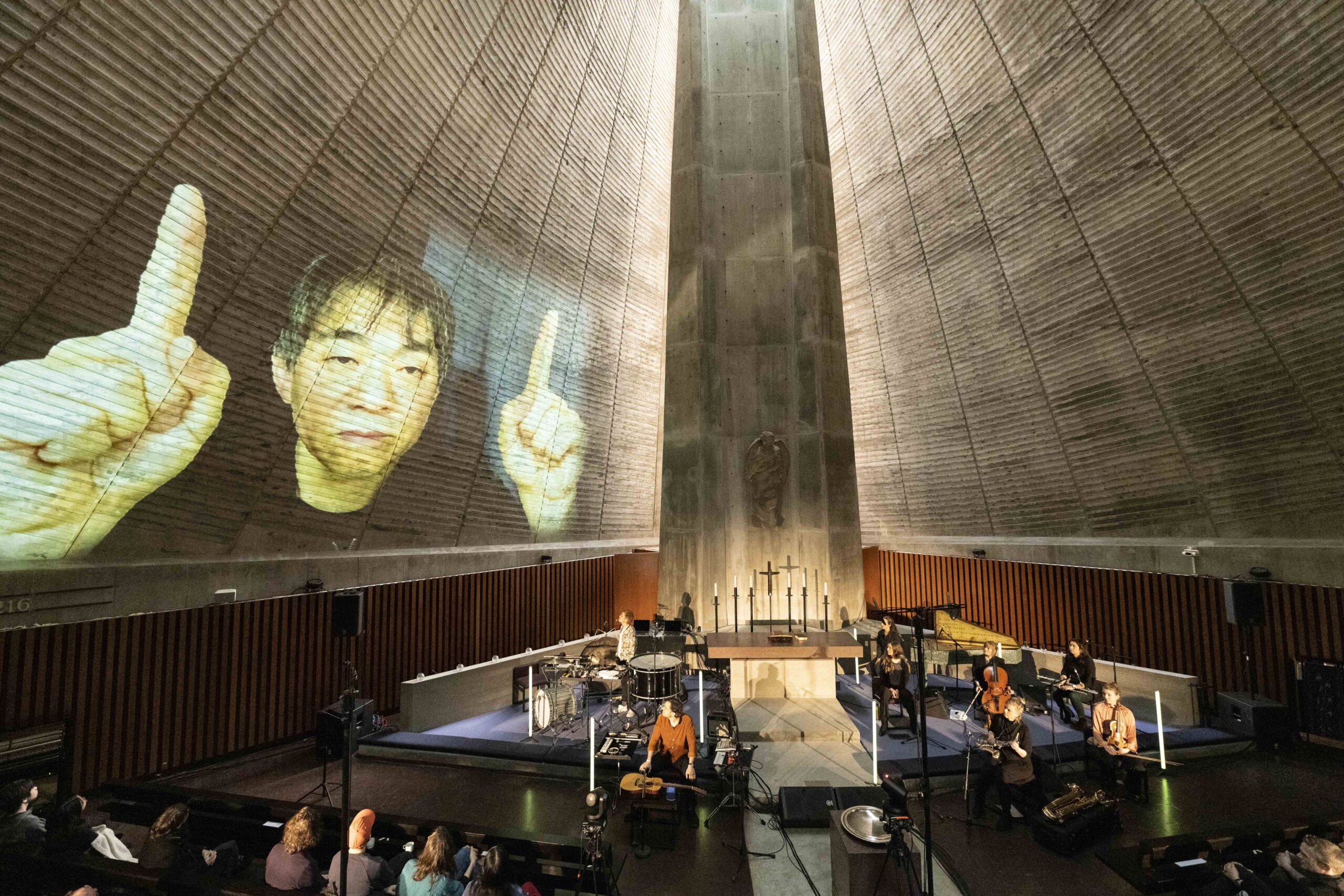 Skikkelsen på veggen har vår fulle merksemd og ser utover publikummet sitt medan han gestikulerar. Ensemble neoN sit i midtskipet i kyrkja, FEN – Far East Network – er med som projeksjonar på kyrkjeveggane. (Foto: Thor Brødreskift/Borealis)