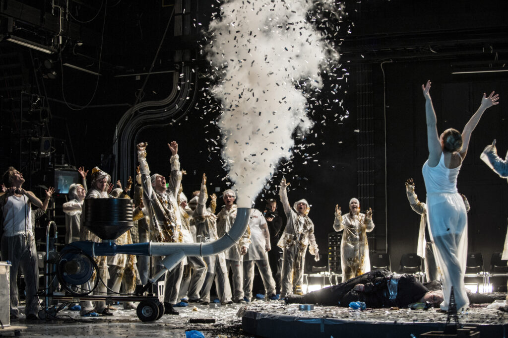 ALLE DØYR PÅ SLUTTEN. – Hovudpersonen treffer kjærleiken ute på oljeplattforma, men heile verda går under før dei får sjanse til å kyssa kvarandre, seier Knut Vaage om operaen «Khairos», som blei framførd på operaen i Bjørvika i 2013. På biletet ser vi korleis sivilisasjonen går under i ein stor «blowout», samstundes som folket har ei stor feiring med konfettikanon. Musikk: Knut Vaage, libretto: Torgeir Rebolledo Pedersen. (Foto: Dunatelevision/Youtube)