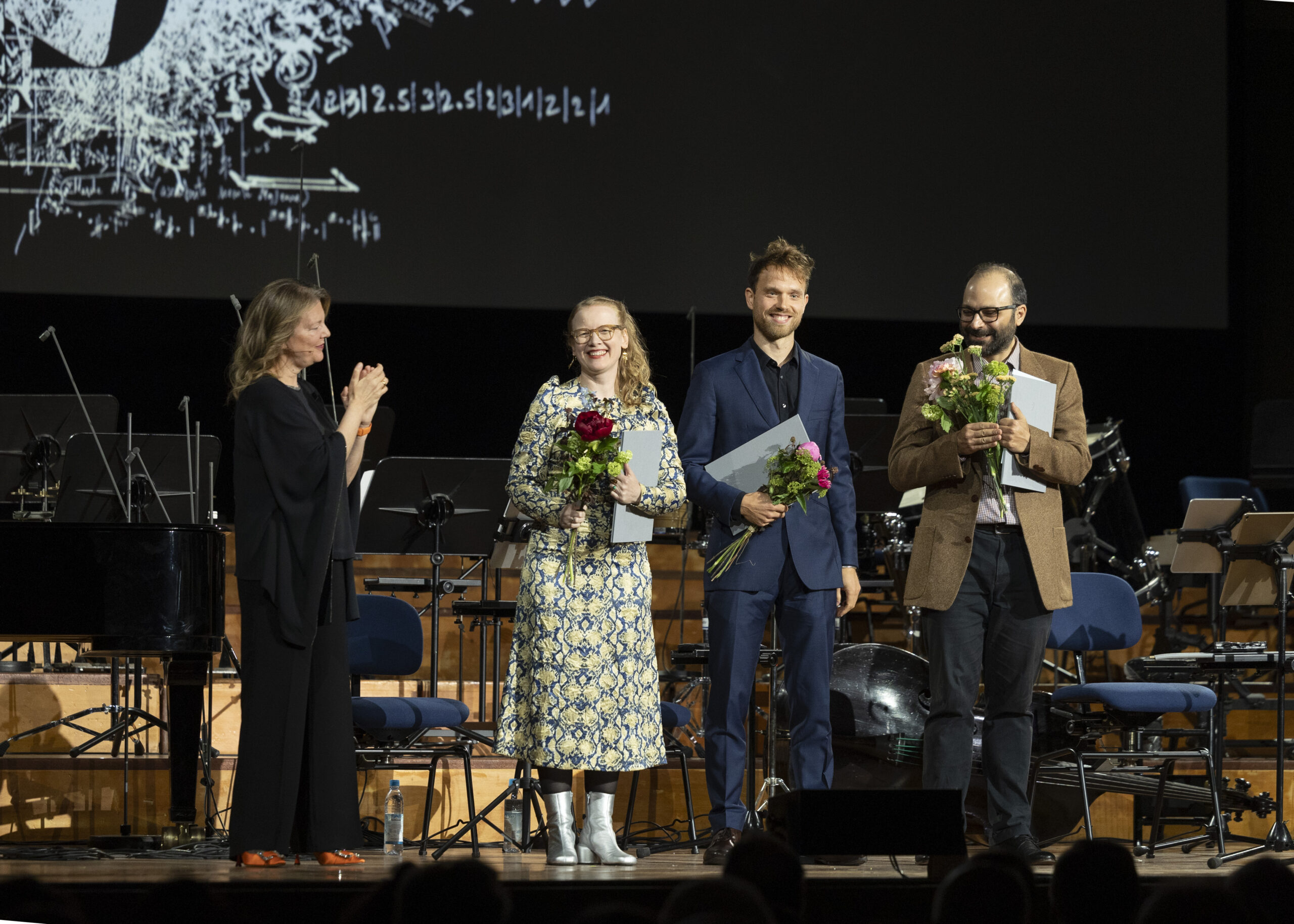 Ilona Schmiel delte ut Ernst von Siemens’ komponistpriser til Kristine Tjøgersen, Bastien David og Ashkan Behzadi. (Foto: Ernst von Siemens Music Foundation | Astrid Ackermann)