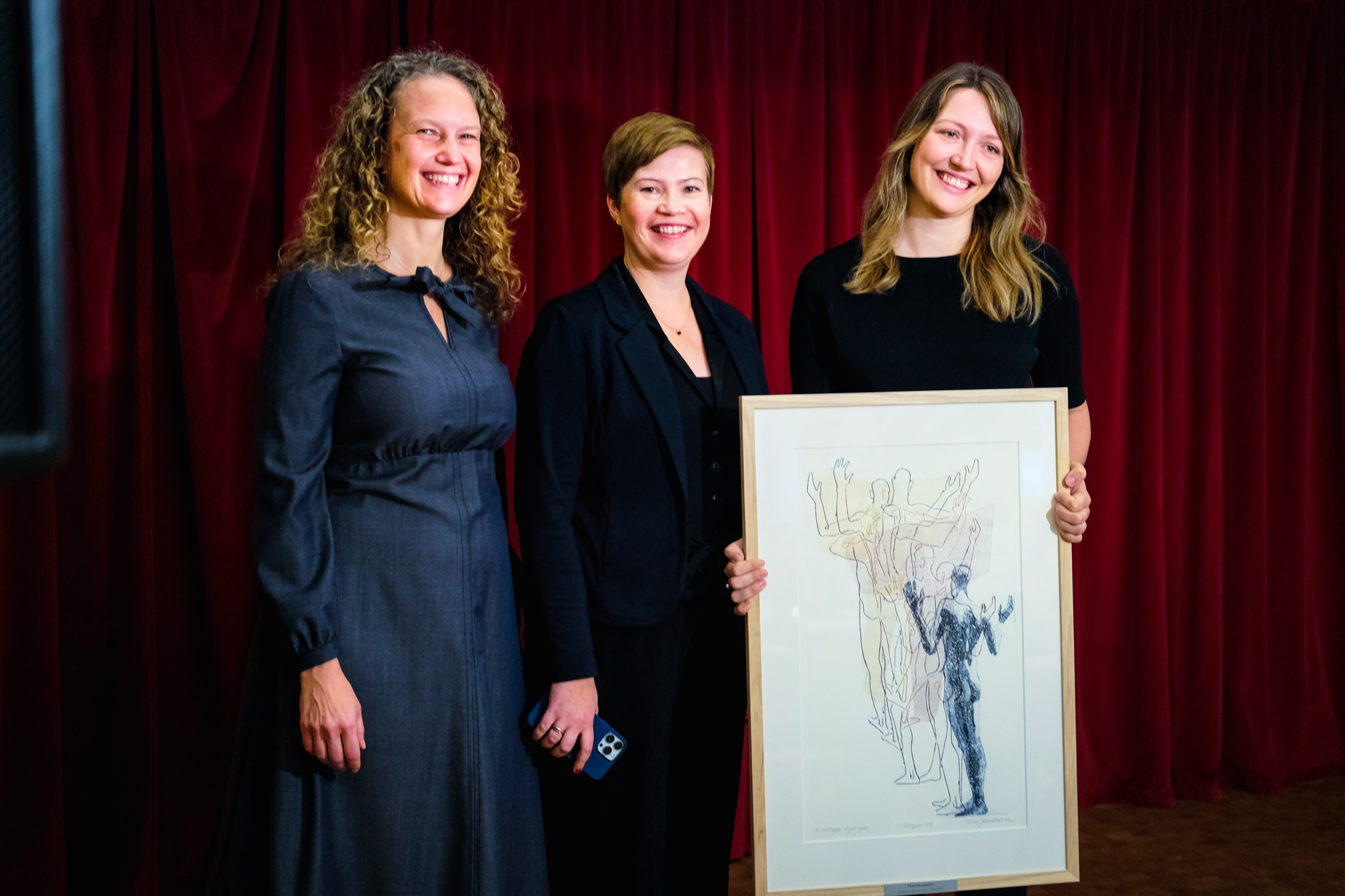Overrekkelse av Kritikerprisen i Litteraturhuset i Oslo. Fra venstre Ingeborg Dalheim (sanger i Solistkoret), Ingvild Skaatan (daglig leder i Solistkoret) og Mari Askvik (sanger i Solistkoret). Prisen er et trykk av Tom Gundersen. (Foto: )