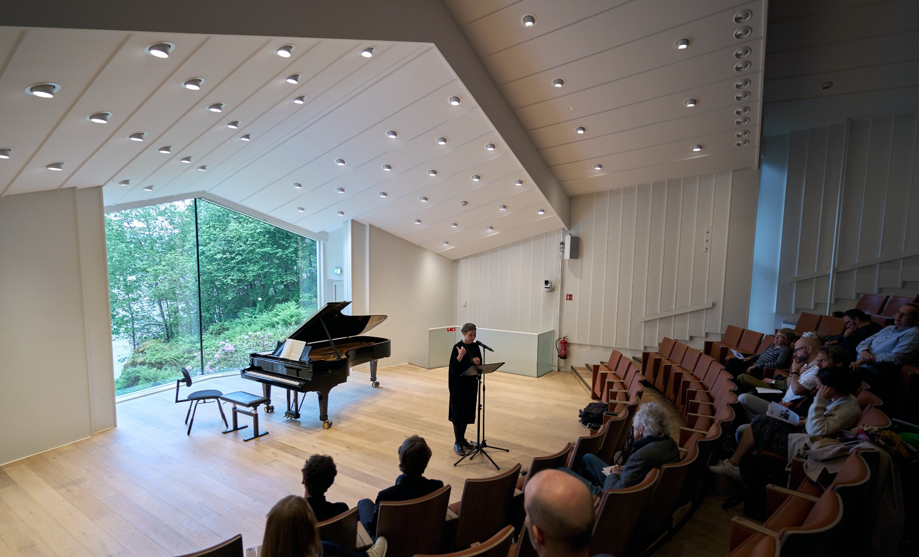 Filosof og komponist Rebecka Sofia Ahvenniemi er huskomponist hos KODE i Bergen dette året. Som del av oppdraget holdt hun nylig en konsertforelesning på Troldhaugen i Bergen. Konsertforelesningen hadde tittelen "Lyd, stillhet og mellomrom", og tok for seg ulike perspektiver på musikalsk stillhet og musikalske mellomrom. (Foto: Sjur Pollen)