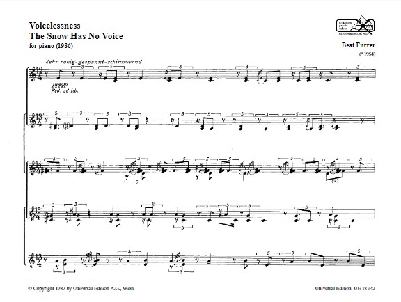 Førstesiden til Beat Furrers noter til Voicelessness. The Snow Has No Voice. (Foto: Universal Edition)