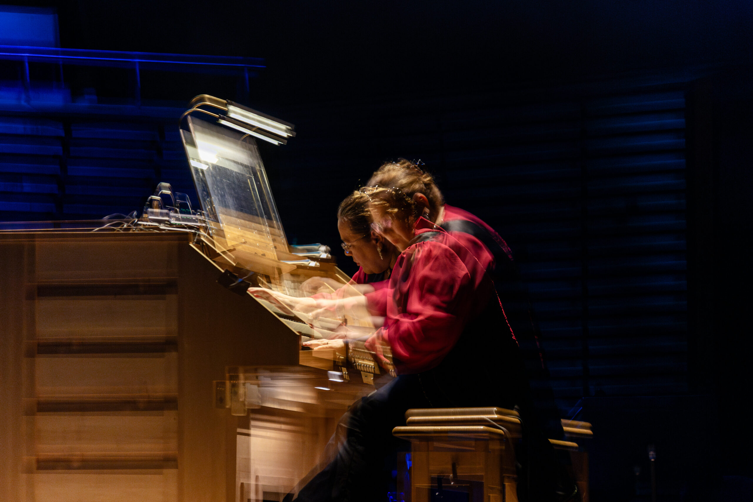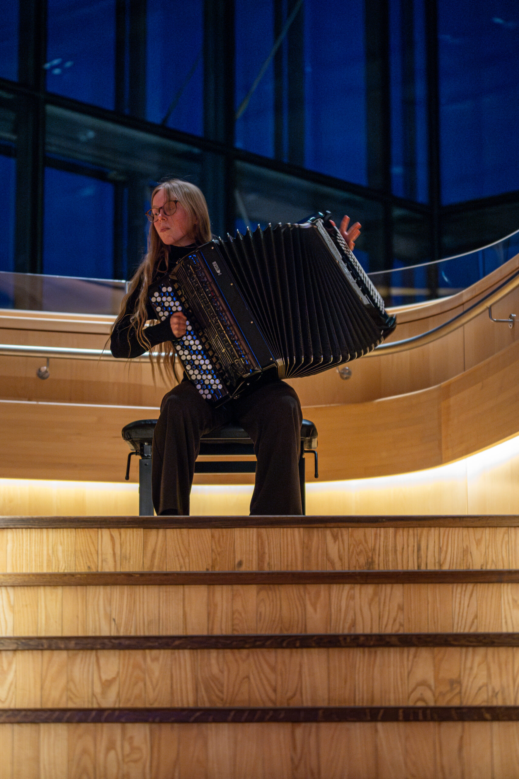 Fra orgelets brøl i avslutningen av Jan Esra Kuhls Wendeltreppe, fikk vi i den første pausen på orgelnatten høre, og ikke minst se, den performative nymusikk-akkordeonisten Maren Sofie Nyland Johansen mens også hun slåss med akkordeonet i en (passende nok) vindeltrapp.