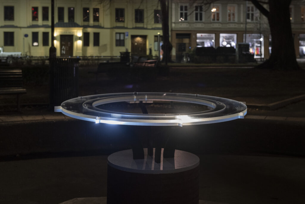 HC Gilje sine verk, Night shift og Origo. Night shift lagar nærmast ein scenografi på veggane på Atelier Nords kontor i 3. etasje. Lysverket er meint å sjåast utanfrå etter mørkets frambrot. Origo er plassert midt på fontena i sirkelen. Roterande lys sender lyssignal frå ein liten tallerken. Det er svake lys, det er subtilt. Lysforureining frå for eksempel gatelykter demper effekten av lyssignala.
