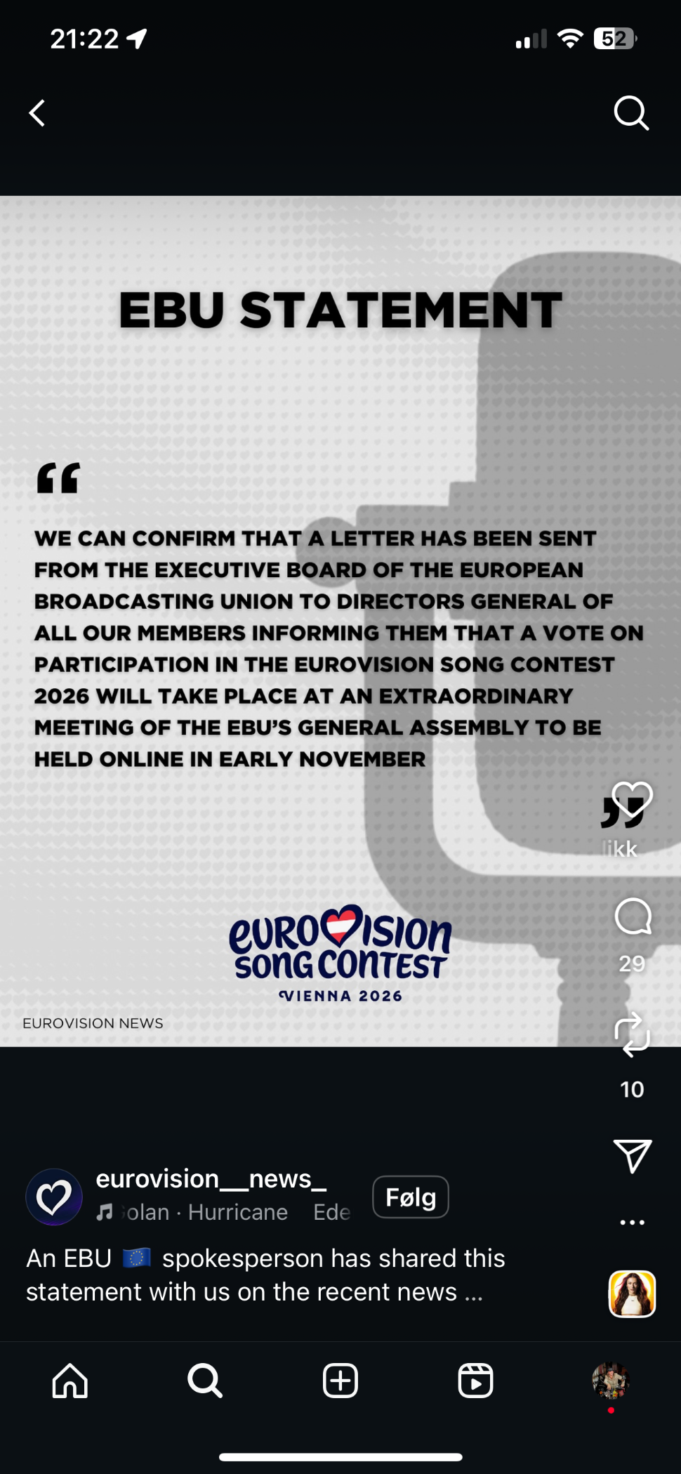 EBUs offisielle melding, skjermbilde hentet fra Instagram 25. september 2025. (Foto: Guro Kleveland / Ballade)