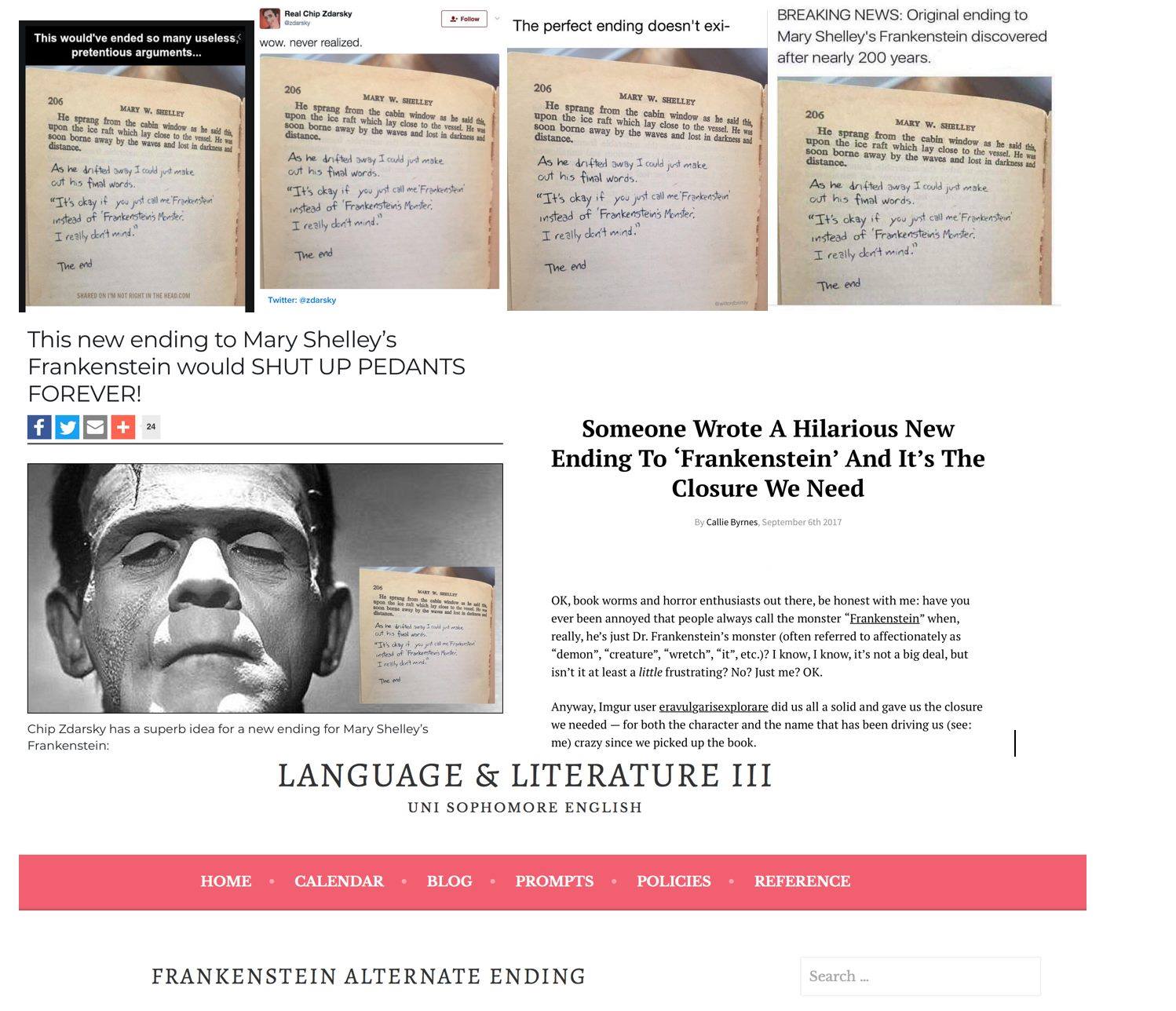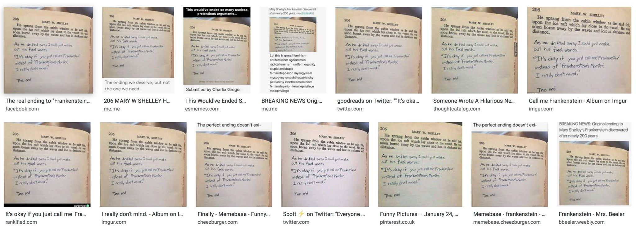 Denne uka kom han tilfeldig over et bilde på Facebook han stusset ved. Bildet var postet av en venn av ham, og viste sistesiden i en bok, der sluttordene var skrevet inn for hånd, med kulepenn. Boka var Mary W. Shelleys Frankenstein, og sluttordene lød slik: