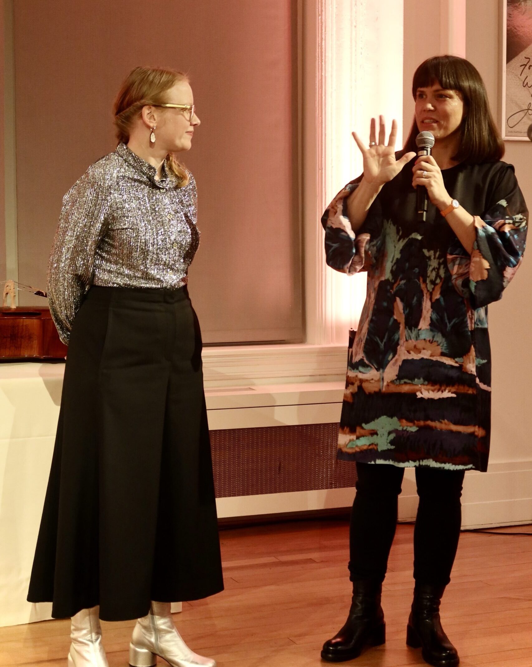Kristine Tjøgersen (til venstre) og Benedicte Maurseth forteller om verket Elja på Det norske generalkonsulatet i New York i mars. (Foto: Det norske generalkonsulatet i New York)