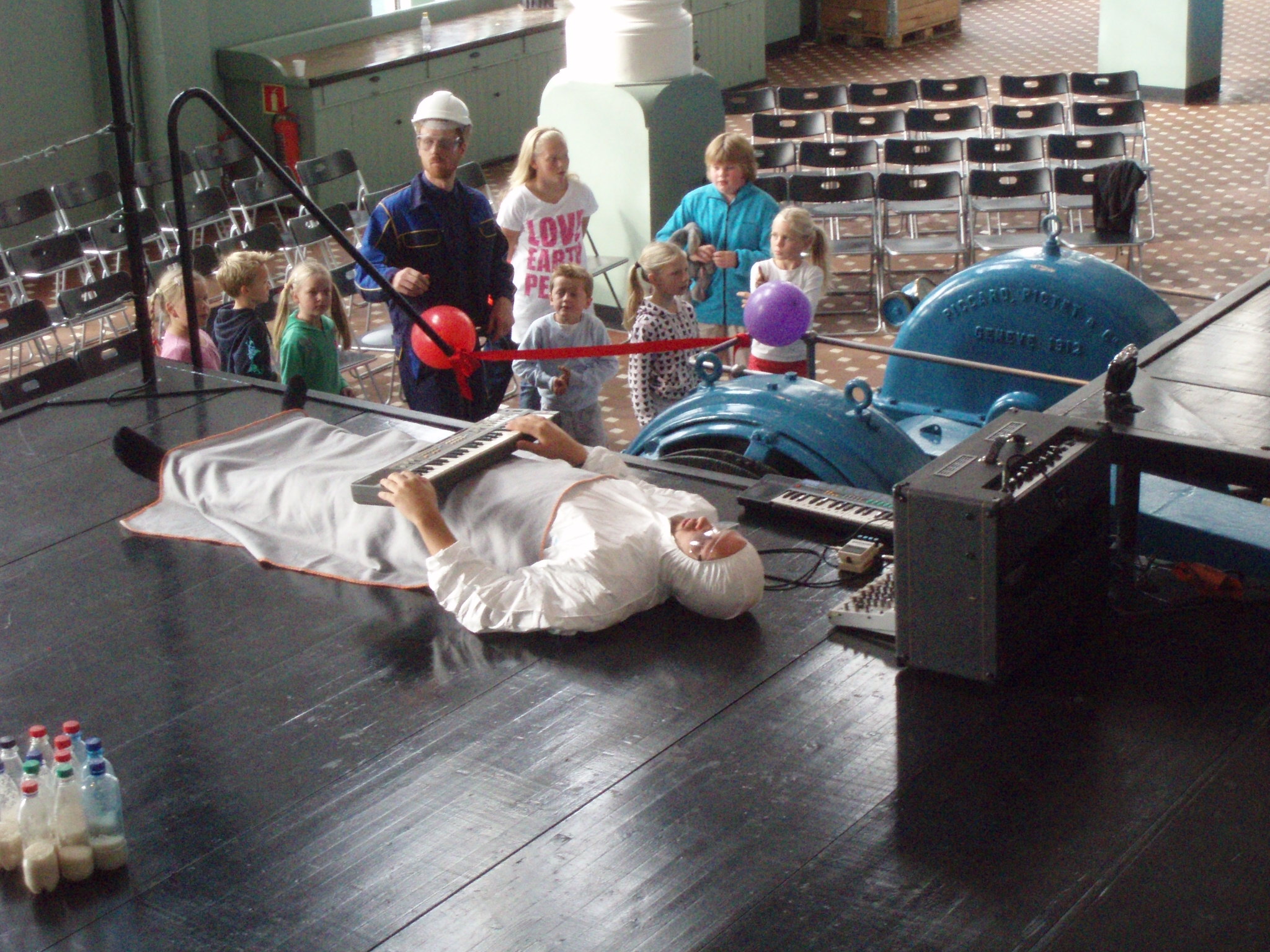 RYTME OG RØYK I TYSSEDAL: I kraftmuséet i Tyssedal gjorde vi hele turbinhallen om til en musikkfabrikk i «25 minutters arbeidsdag». Innstempling ble å vekke musikerne og introdusere hovedmelodiene. Arbeidet ble rytme og røyk. Lunsj ble stemninger og ekko fra knaskende gulrøtter, og til slutt ble de ulike elementene satt sammen til en sang som alle hadde vært med å lage. Musikere var Omar Johnsen, Fredrik Vogsborg, Matias Monsen, Kjetil Aabø og Ketil Kinden Endresen. (Foto: Ketil Kinden Endresen)