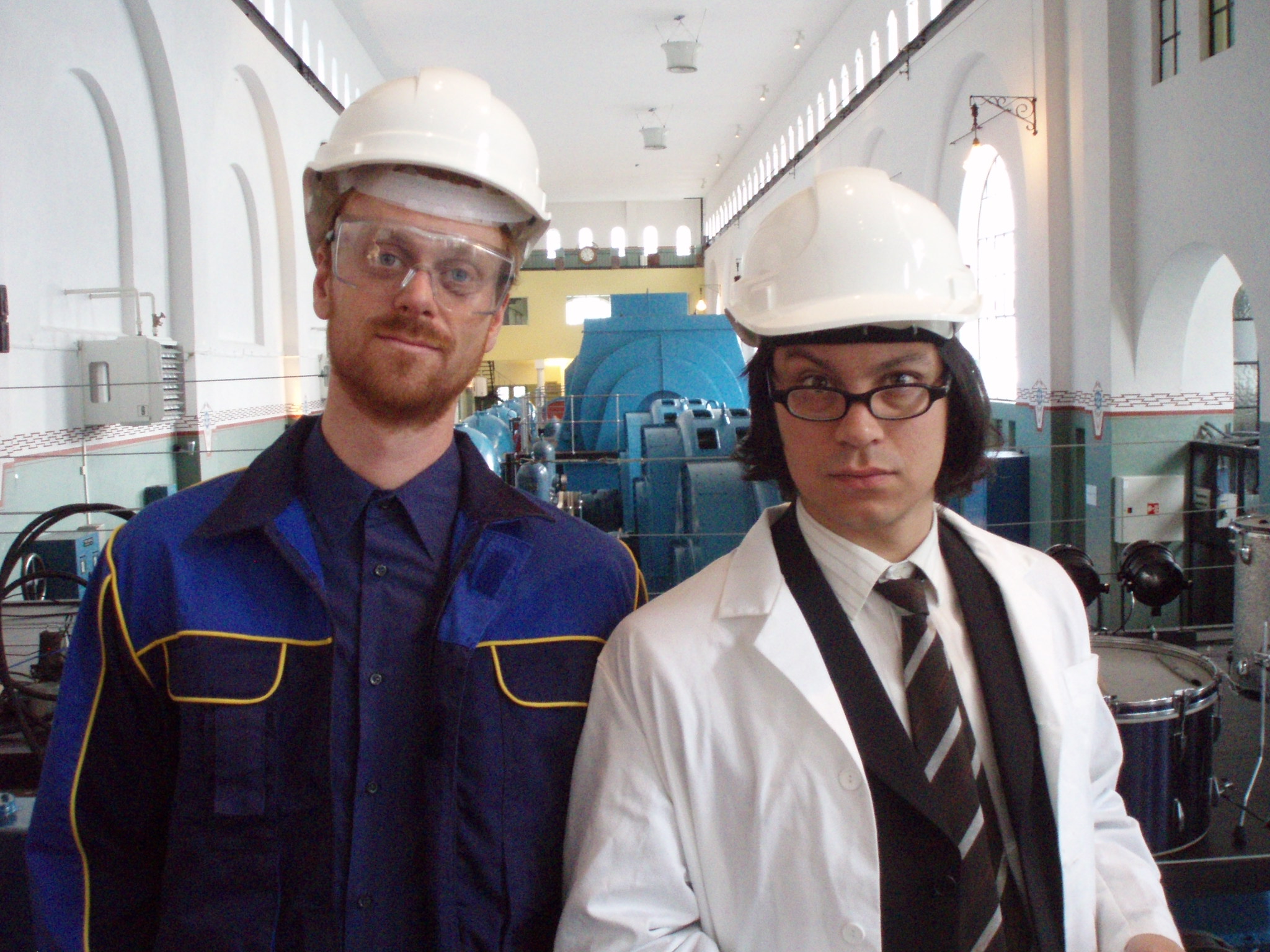 FERDIG FOR DAGEN: Kjetil Aabø og Omar Johnsen med lydinstallasjonen og produksjonen «25 minutters arbeidsdag», der kraftmuséet i Tyssedal ble omgjort til en musikkfabrikk. (Foto: Ketil Kinden Endresen)