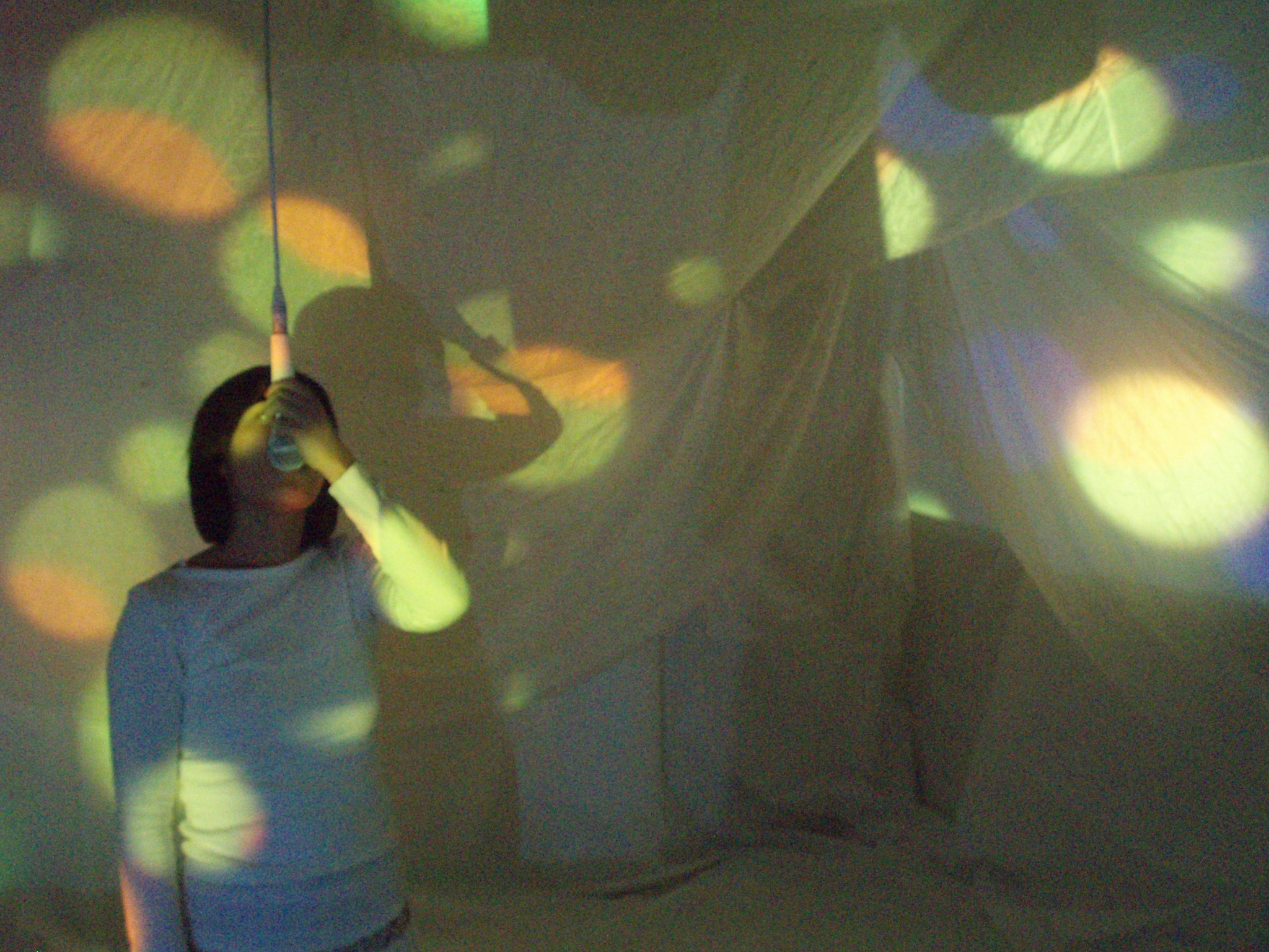 HØRER DU LYSET? I installasjonen «Aurora Borealis» ved Barnas Kulturhus i Bergen i 2003 ble barnas møte med kunsten inspirert av det samiske ordet for nordlys, Guovssahas, som løst kan oversettes til «det hørbare lyset». Rommet ble forvandlet til en «ishule» av hvite pledd, der hvitmalte mikrofoner hang ned fra taket som istapper, og prosjektører omgjorde barnas stemmer til farget lys. (Foto: Ketil Kinden Endresen)
