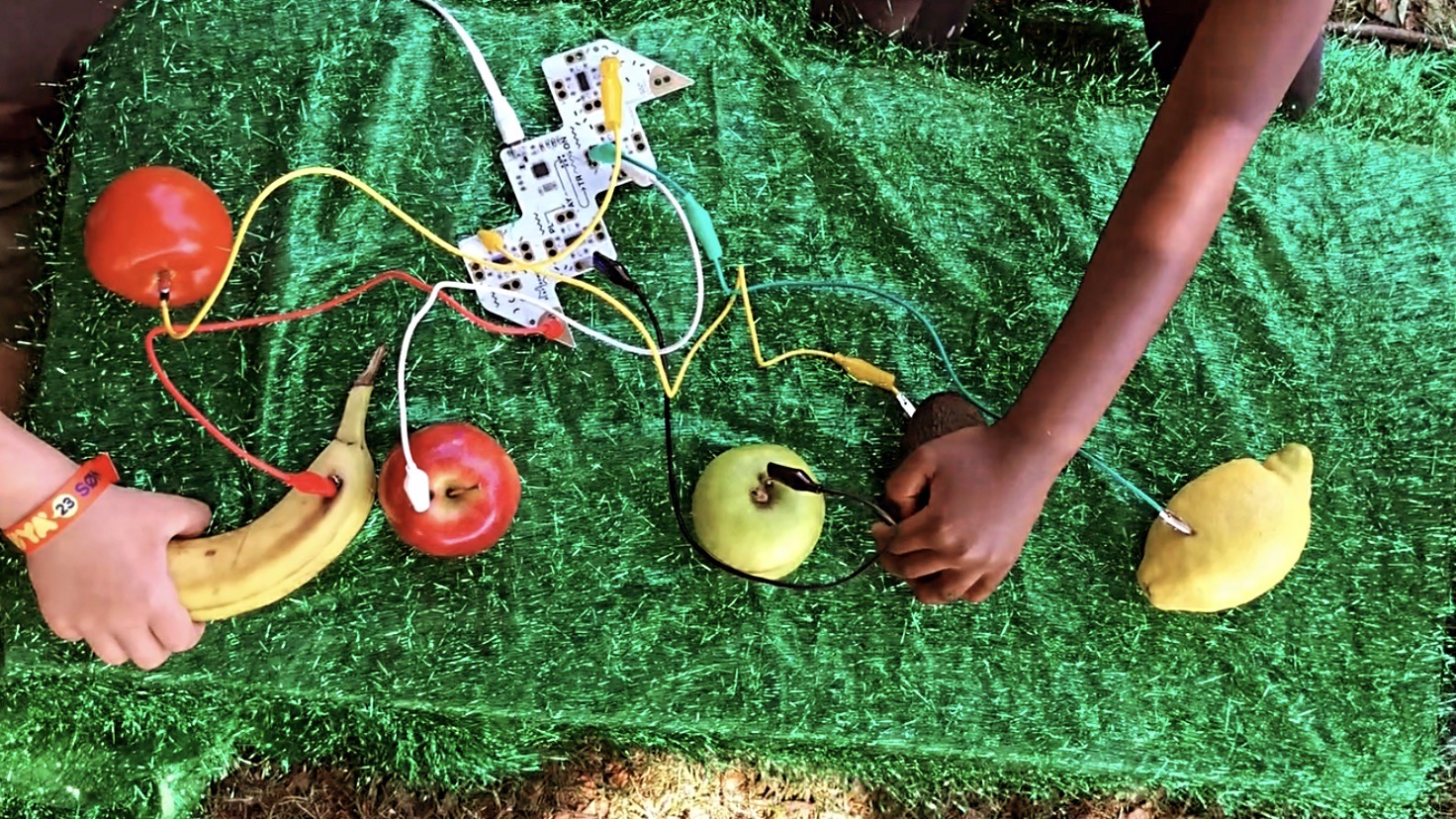 Som en del av installasjonen hadde vi satt opp en liten interaktiv lydstasjon hvor barna kunne ta på frukter som trigget ulike lydeffekter sammen med det syngende treet.
