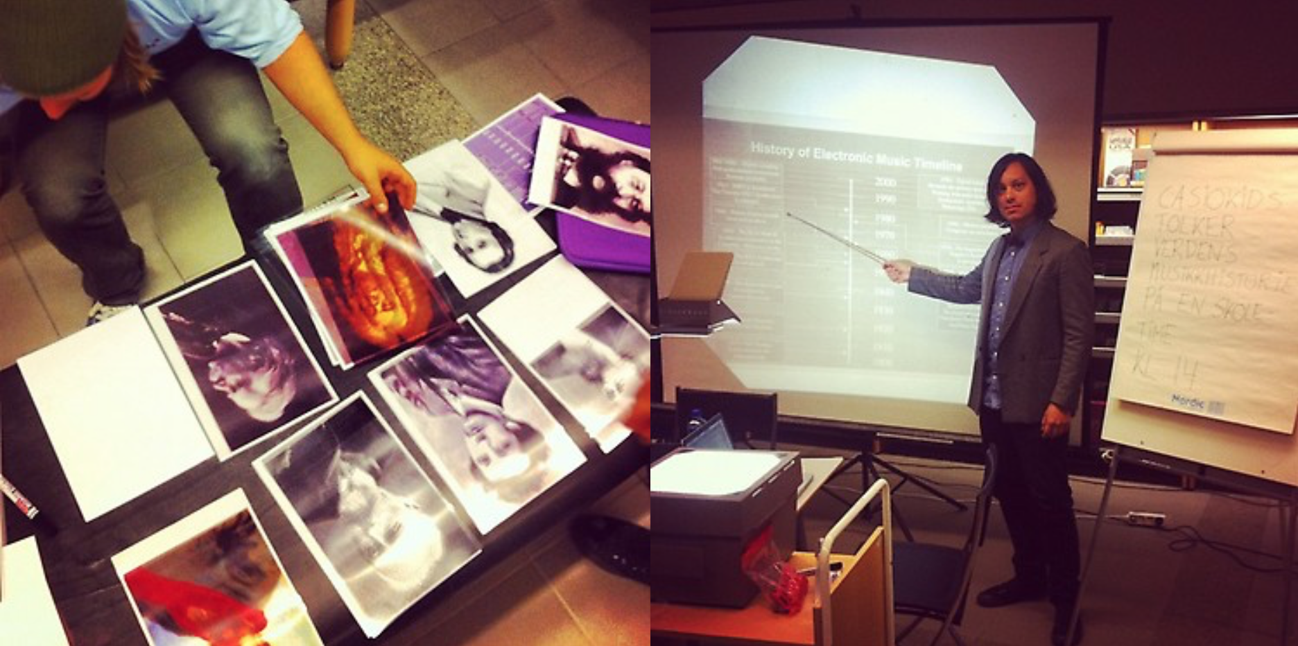 MUSIKKHISTORIEN PÅ EN SKOLETIME: På Sølvberget i Stavanger fremførte vi «Musikkens historie på 45 minutter«, og spilte oss gjennom menneskets musikalske reise i ekspressfart fra urtid til nåtid, komplett med pekestokk, overhead-transparenter, synthimprovisasjon og et lappeteppe av samples med alt fra naturlyder via folkemusikk og Mozart til a-ha. Vi vurderte å gjøre litteraturens historie samtidig for å ha med tekst, men bestemte oss til slutt for å begrense omfanget ved å holde det utelukkende instrumentalt. Musikere var Omar Johnsen, Fredrik Vogsborg og Ketil Kinden Endresen. (Foto: Ketil Kinden Endresen)