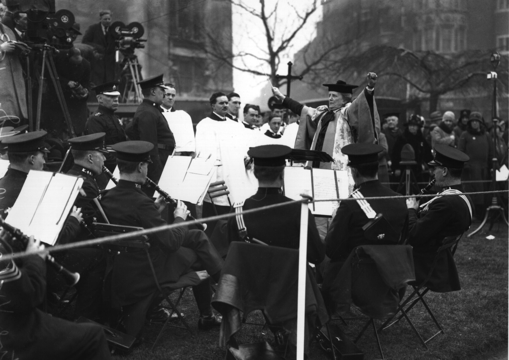 Smyth dirigerer sin “ The March of the Women” i 1930, på avdukningen av en statue av suffragetten og feministen Emmeline Pankhurst i London. (Foto: Central Press/Getty Images)