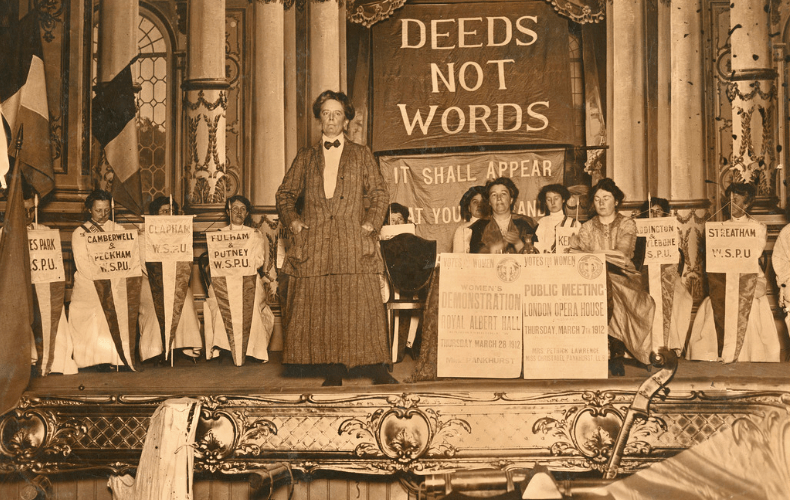 Det var likevel én strid som var større enn noen annen. Det var kampen for stemmerett for kvinner. Nå raste den i England, for suffragettene hadde sett seg mer enn trøtte på festtaler og lovnader som ikke ble noe av. «Deeds, not words,» ropte de, og gikk til militante aksjoner. De lagde bomber av sennepsbeholdere og melkespann, og dermed eksploderte det i postkasser så vel som i Westminster Abbey (juni 1914). De ville se handling.