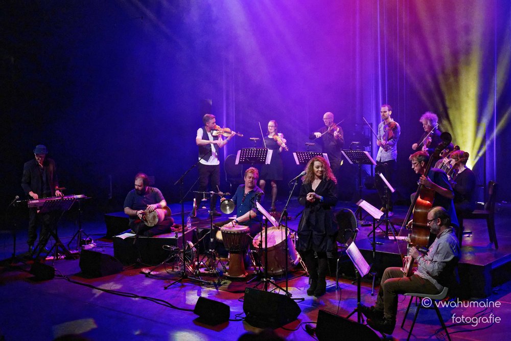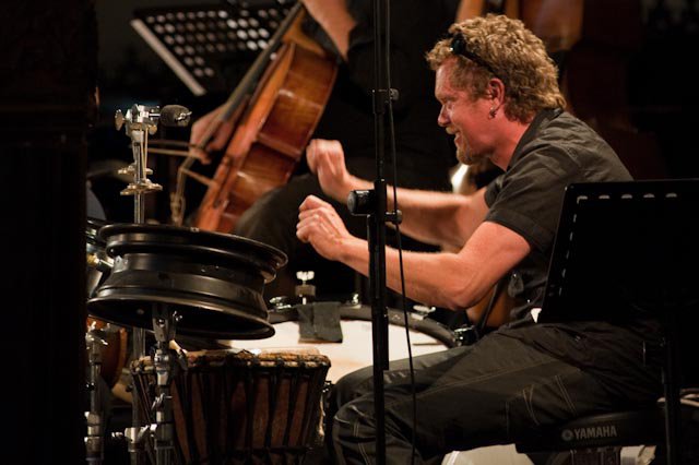 Helge Andreas Norbakken i bandet Siwan, et musikkinitiativ av Jon Balke med blant andre Amina Alaoui, Kheir Eddine M’Kachiche, Jon Hassell og Barokksolistene. (Foto: vwahumaine fotografie)