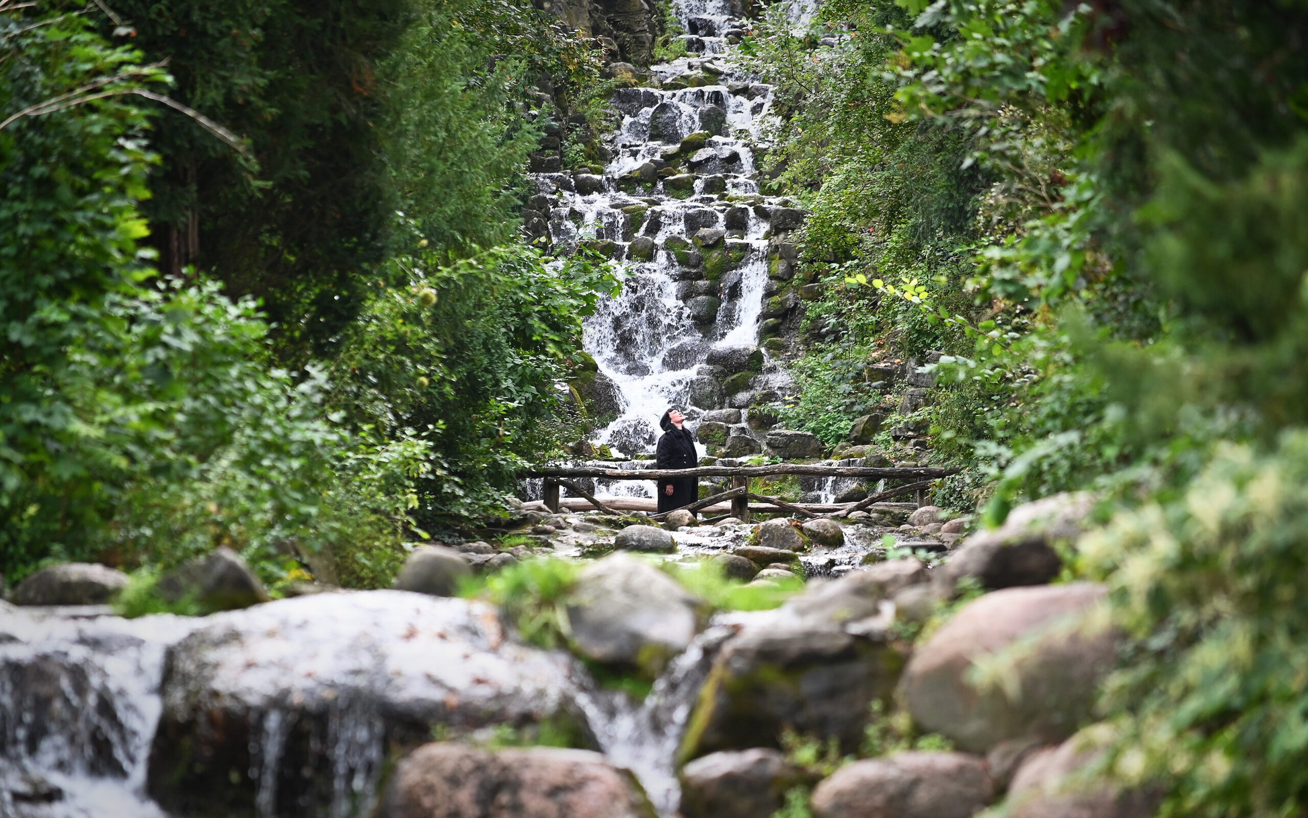 Marita Isobel Solberg og fossefallet i Viktoriapark i Kreuzberg, Berlin. (Foto: Thomas Kolbein Bjørk Olsen, Berlinkontoret)