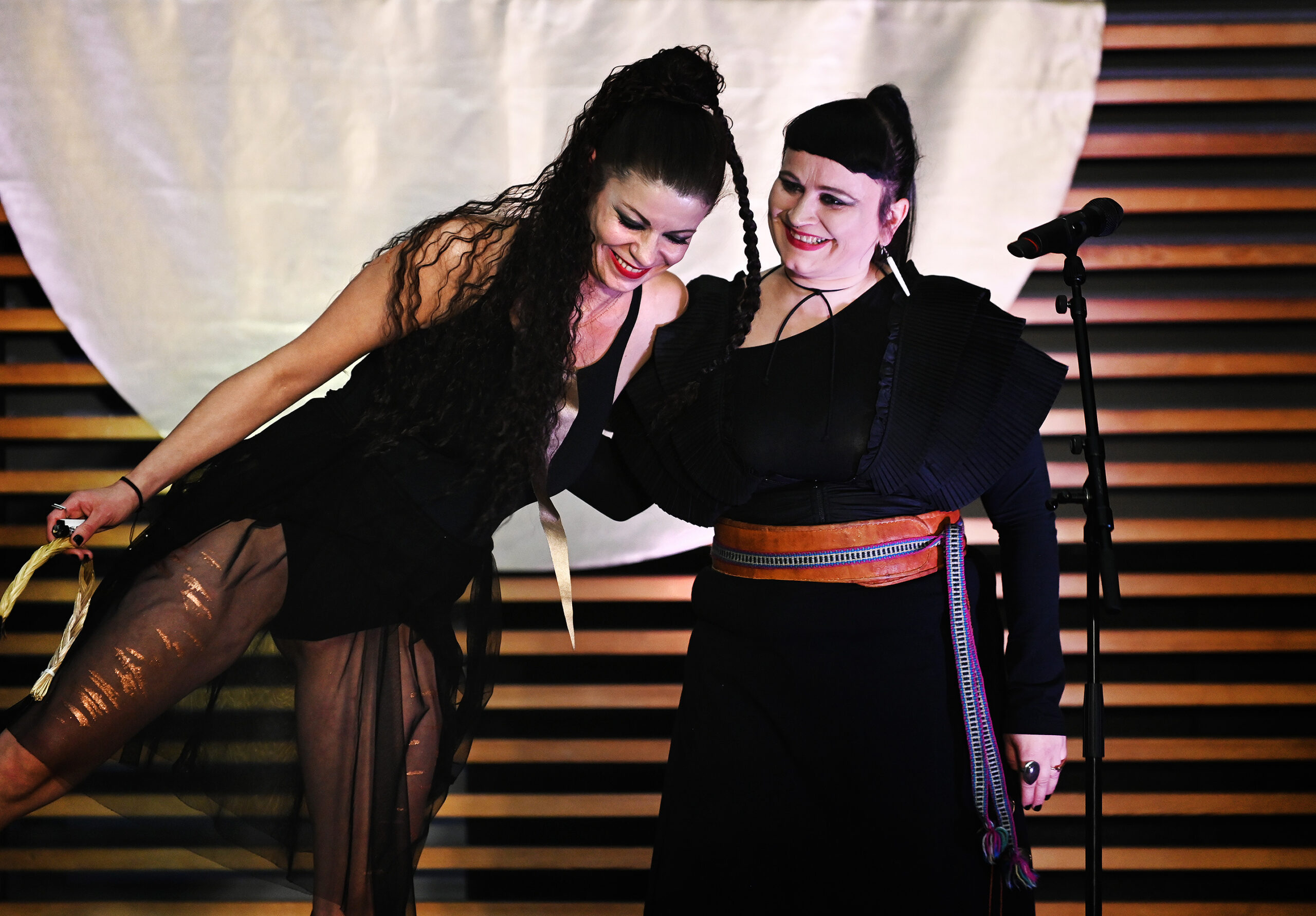Marita Isobel Solberg og Charlotte Bendiks i deres duoprosjekt «Gangere». Her fra en forestilling i Berlin nylig. (Foto: Thomas Kolbein Bjørk Olsen, Berlinkontoret)