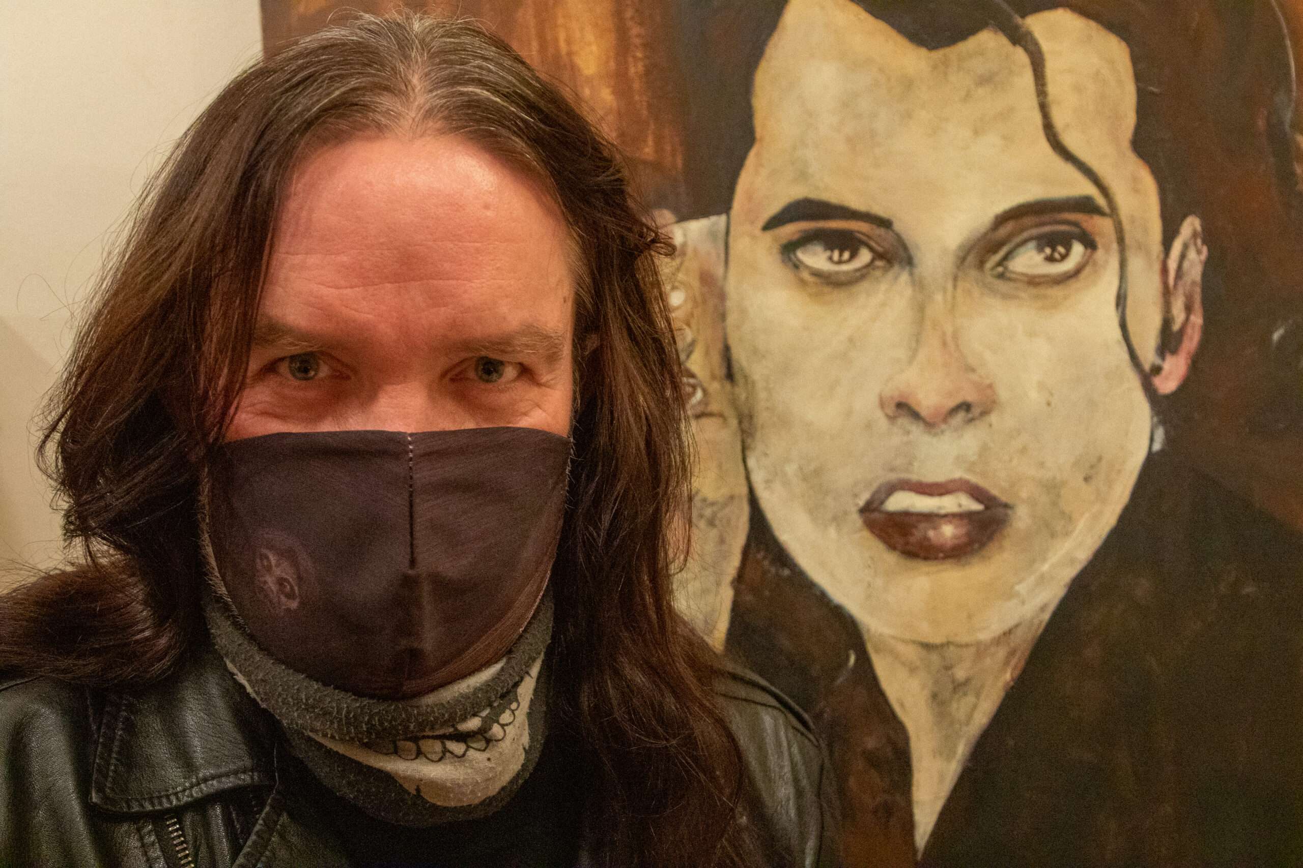 Anders Odden ved et maleri av en venn, kunstneren Vegard Øidvin. Bildet henger til salgs på Retrolykke Kaffebar på Grünerløkka i Oslo. – Det er en original av Vegard, et selvportrett, forteller Anders. (Foto: Erik Valebrokk)