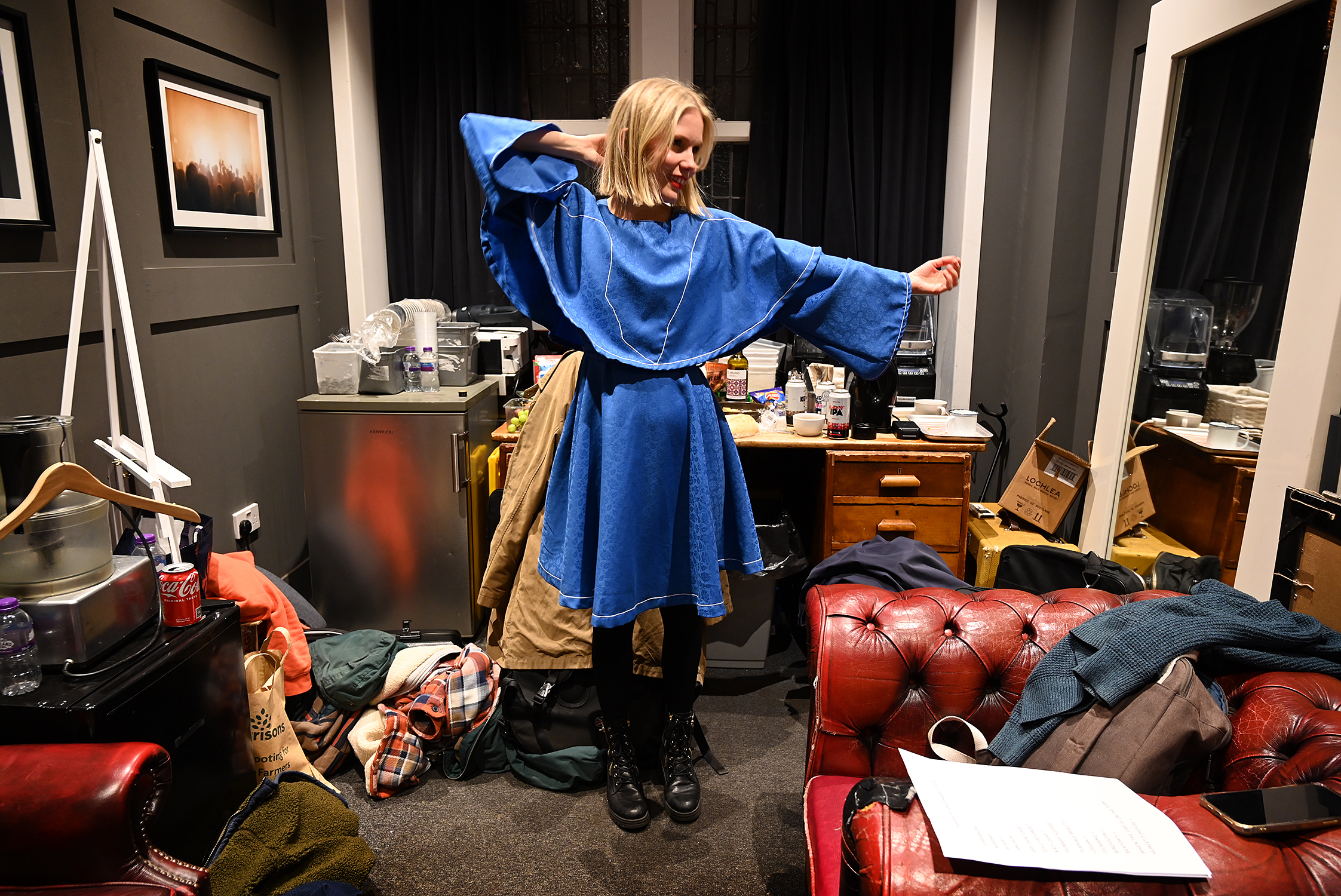BACKSTAGE: Julie Alapnes på en ganske typisk backstage rett etter konserten i St. Luke’s på østkanten i Glasgow. Kanskje ikke så typisk med Chesterfield-møblement på backstage. Den tidligere kirken er nå en prisvinnende musikk- og kulturarena. (Foto: Thomas Kolbein Bjørk Olsen, Berlinkontoret)