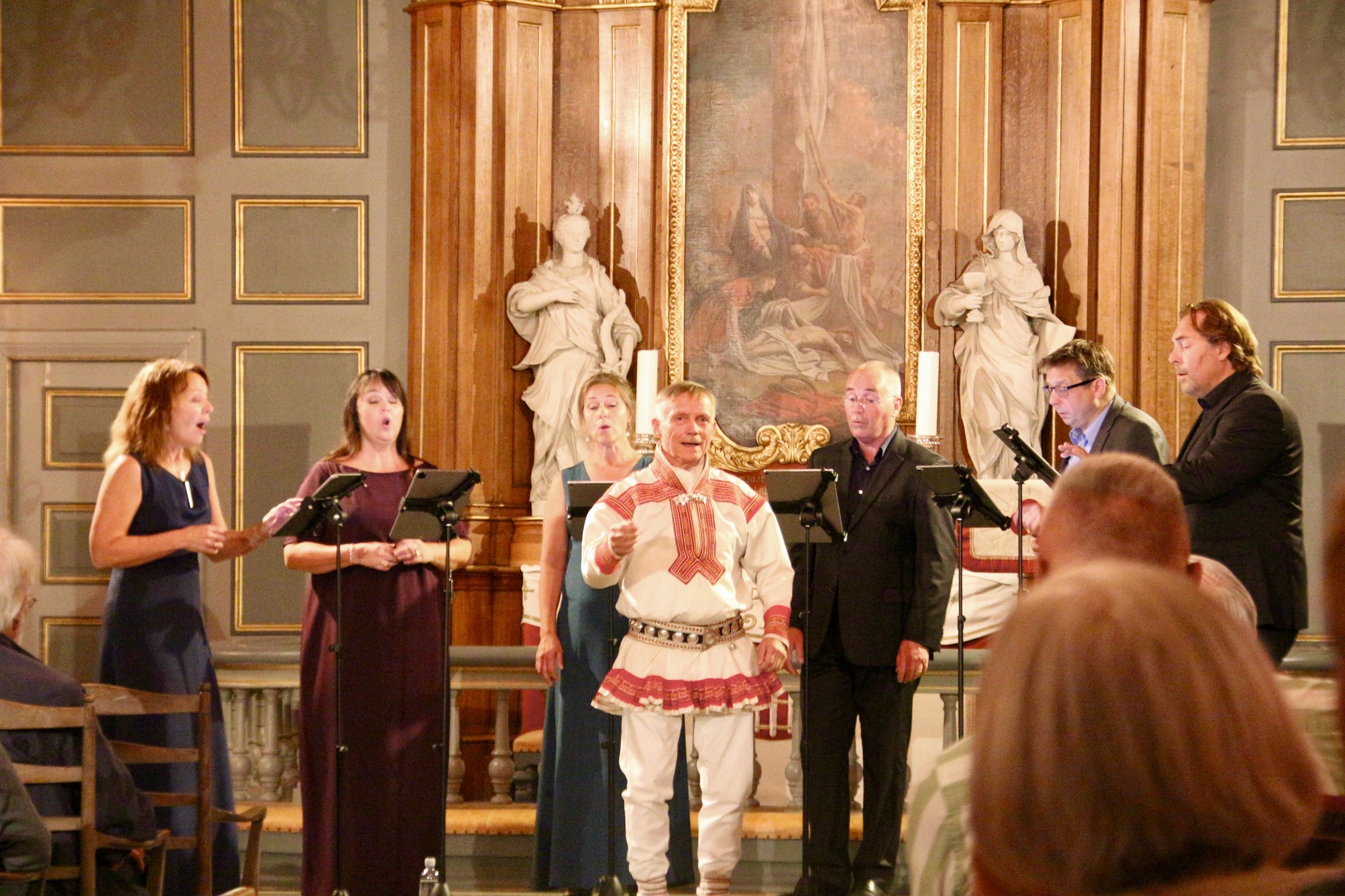 Iŋgor Ántte Áilu Gaup fremfører joiken «Du čábbodaga» («Din skjønnhet») sammen med Nordic Voices på Oslo kammermusikkfestival 12. august 2023. (Foto: Bjarne Kvinnsland)