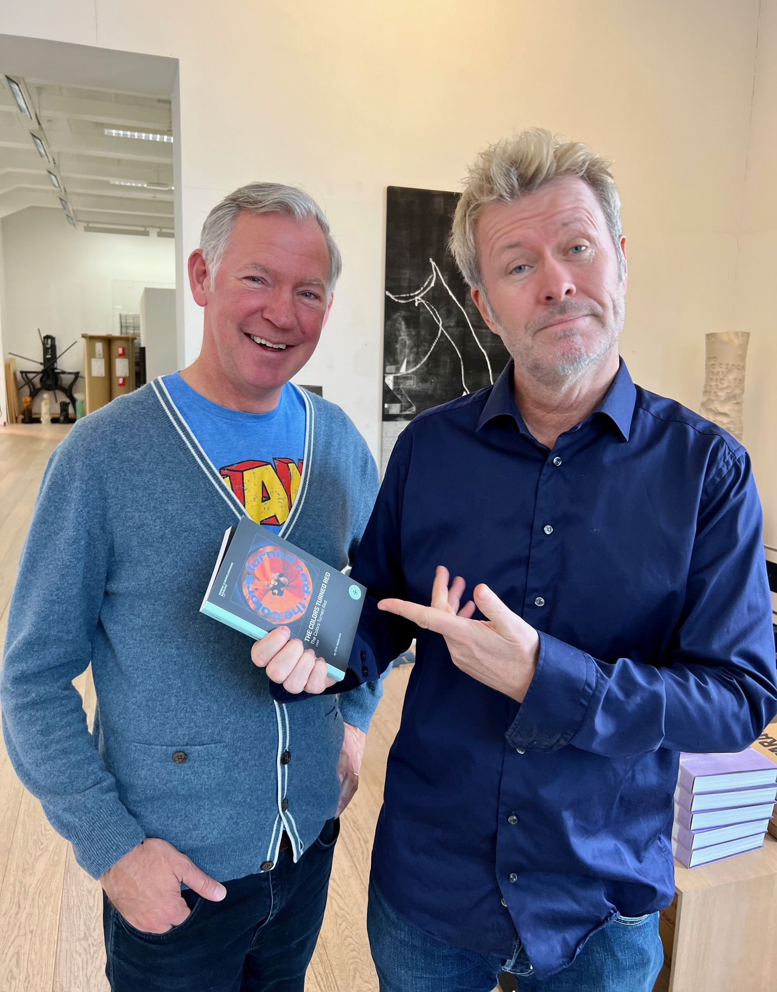 Erik Valebrokk og Magne Furuholmen, også en som gikk kunstens vei. Her med boka kronikkforfatteren skrev om The Colors Turned Red, utgitt i 2022. (Foto: Privat)