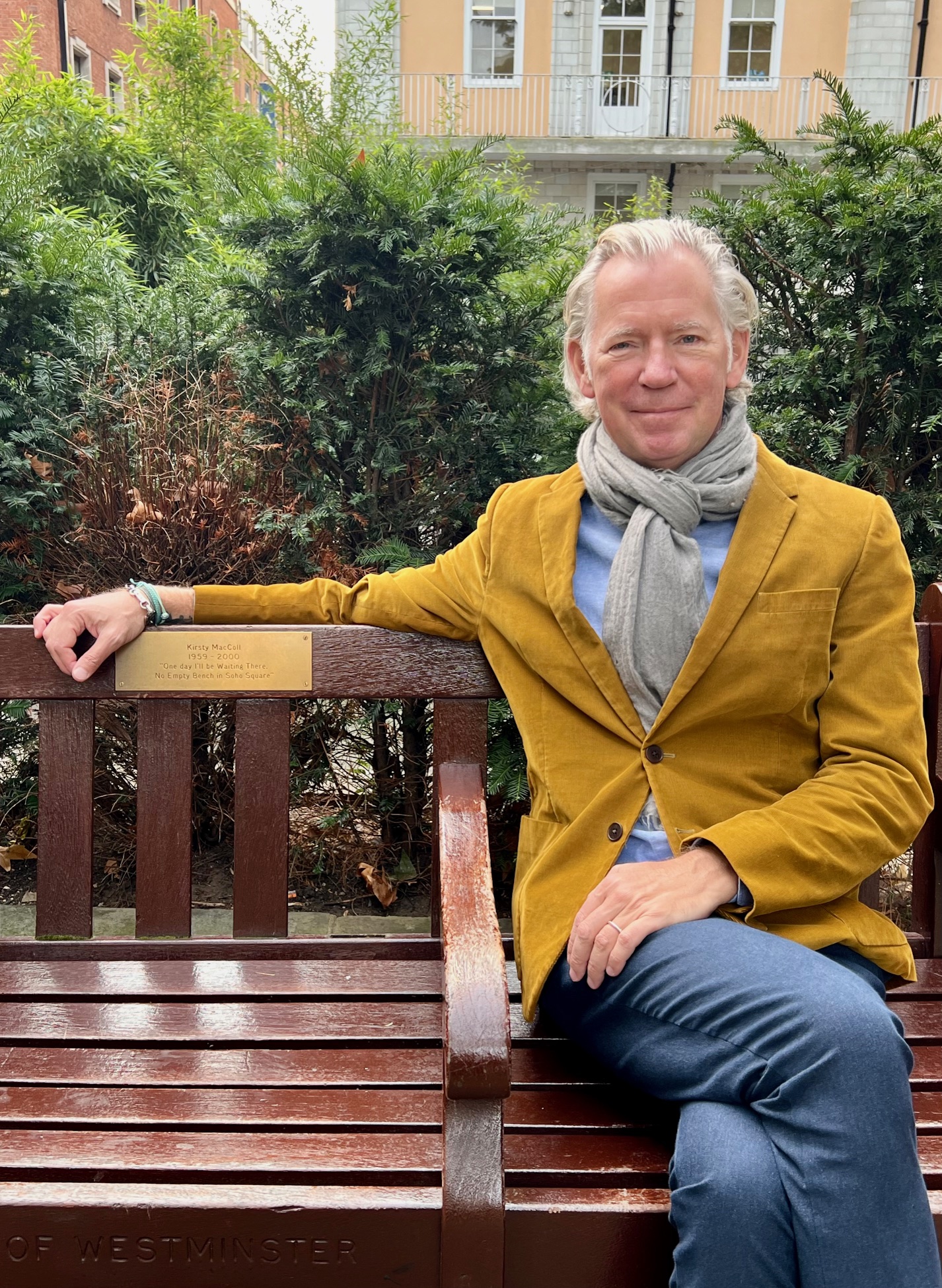 Erik Valebrokk på sitt faste pilegrimsmål, minnebenken til Kirsty MacColl. Den står på Soho Square i London, den lille plassen som har gitt navn til en av hennes mest elskede sanger. – Hun skrev så gode tekster (og melodier) at de bør inspirere alle skrivende mennesker, sier han. (Foto: Privat)