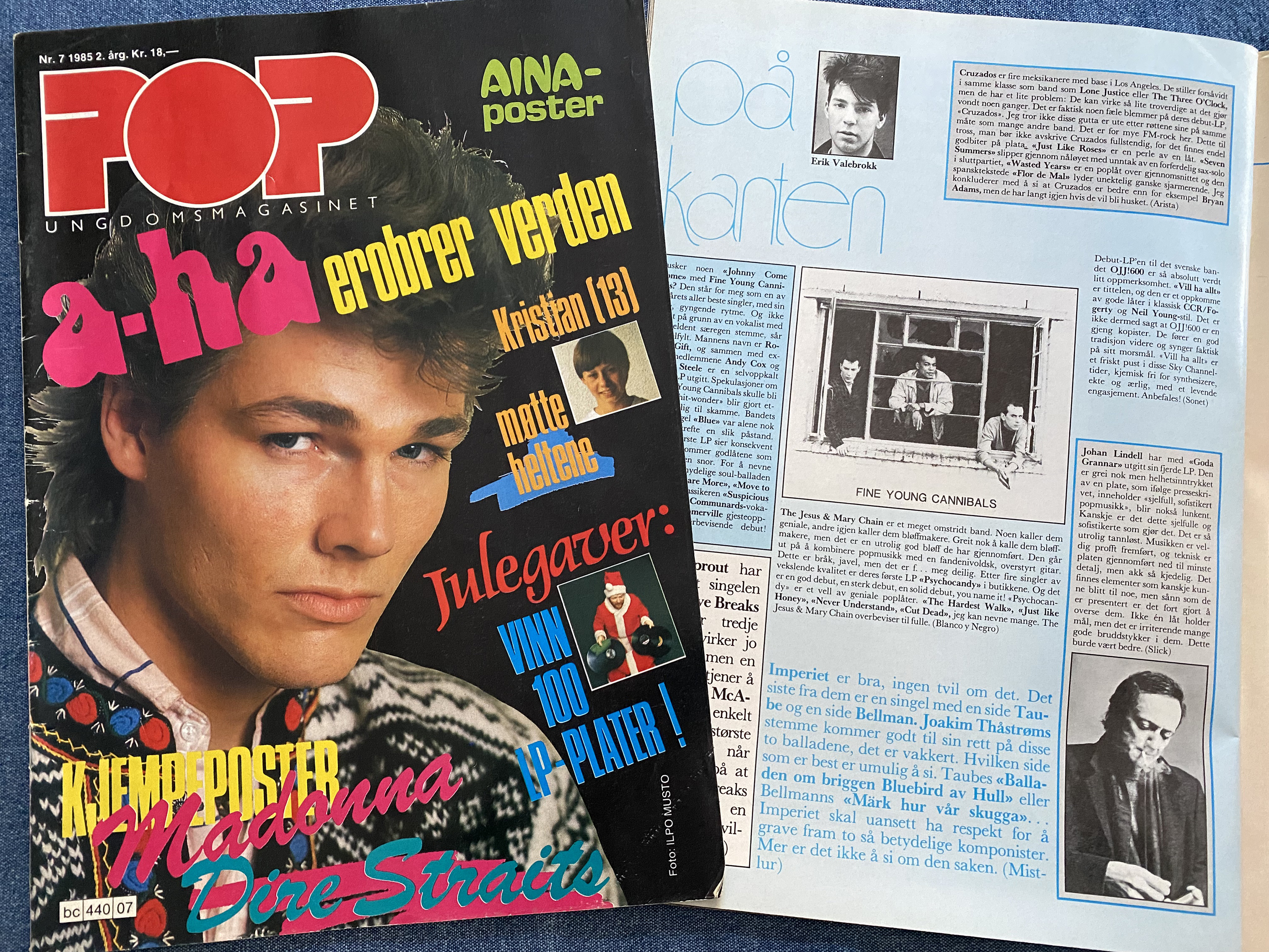 Bladet Pop, nummer 7/1985. Pop var det aller første magasinet kronikkforfatteren skrev i, 19 år gammel. Ved siden av ser du spalten «På kanten» fra utgaven etter, altså 8/1985, med noe mer alternative musikkanbefalinger enn det som ellers var normalt i popmagasinet. (Foto: Privat)