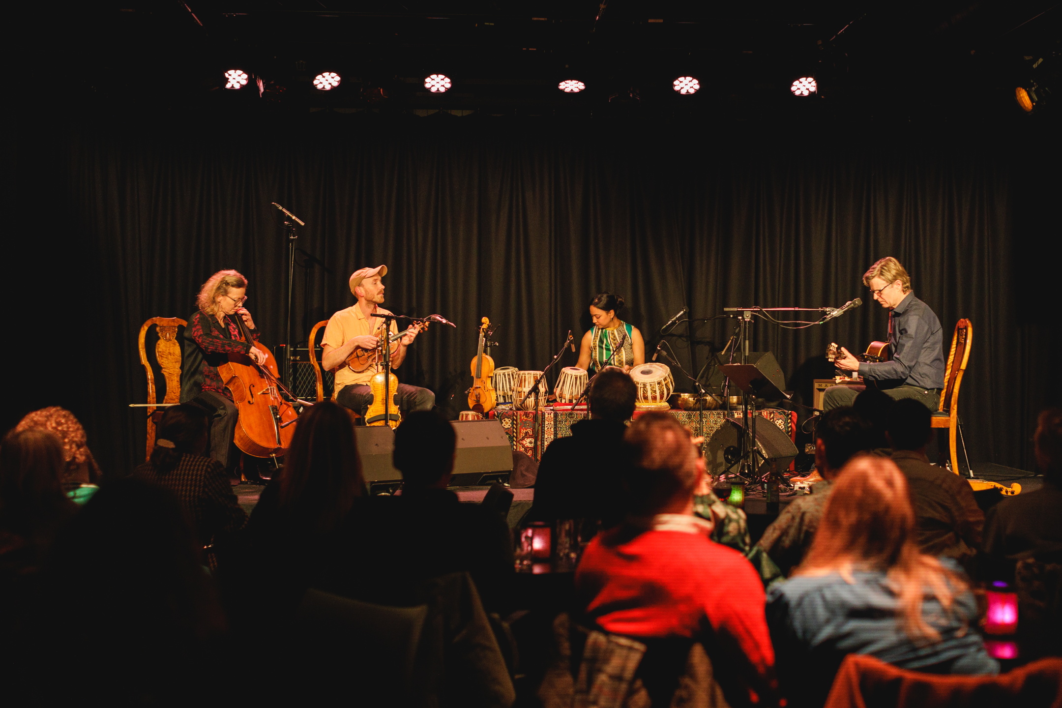 MELLOM FJELL: Erlend Viken og Sanskriti Shrestha urfremførte bestillingsverket og samarbeidsprosjektet Mellom fjell på Riksscenen under årets Oslo World. Fra venstre: Cellist Tanja Orning, Erlend Viken, Sanskriti Shrestha og Anders Røine. (Foto: Darja Olsevskaja)