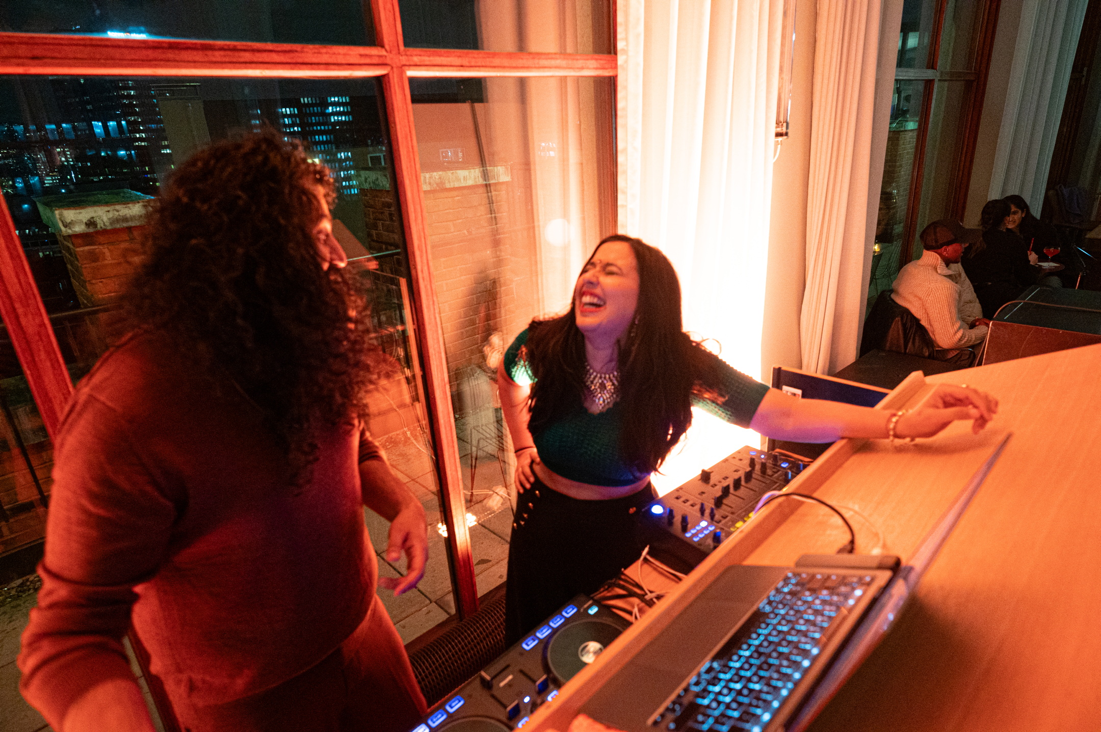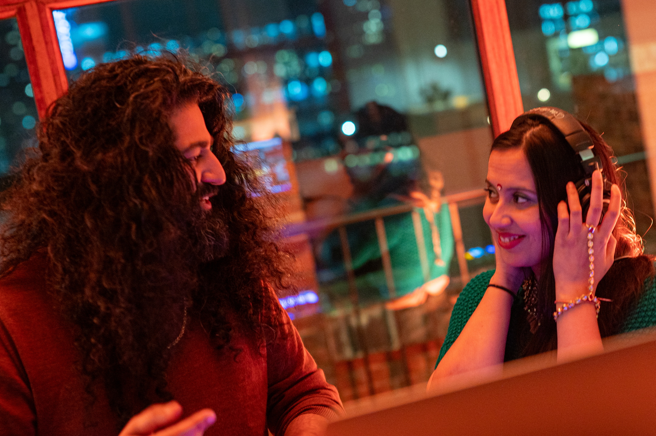 DJ-duoen tar til spakene for første gang på 14 år i forbindelse med Oslo Worlds 30-årsjubileum. Oppe i 12. etasje går jeg inn til noen lekre indiske hip-hoplåter og en lugn, lounge-stemning på Byens Tak. Musikkjournalist og DJ Sandeep med forfatter Neha innvier kvelden med roligere låter over noen drinker inne i lokalet.