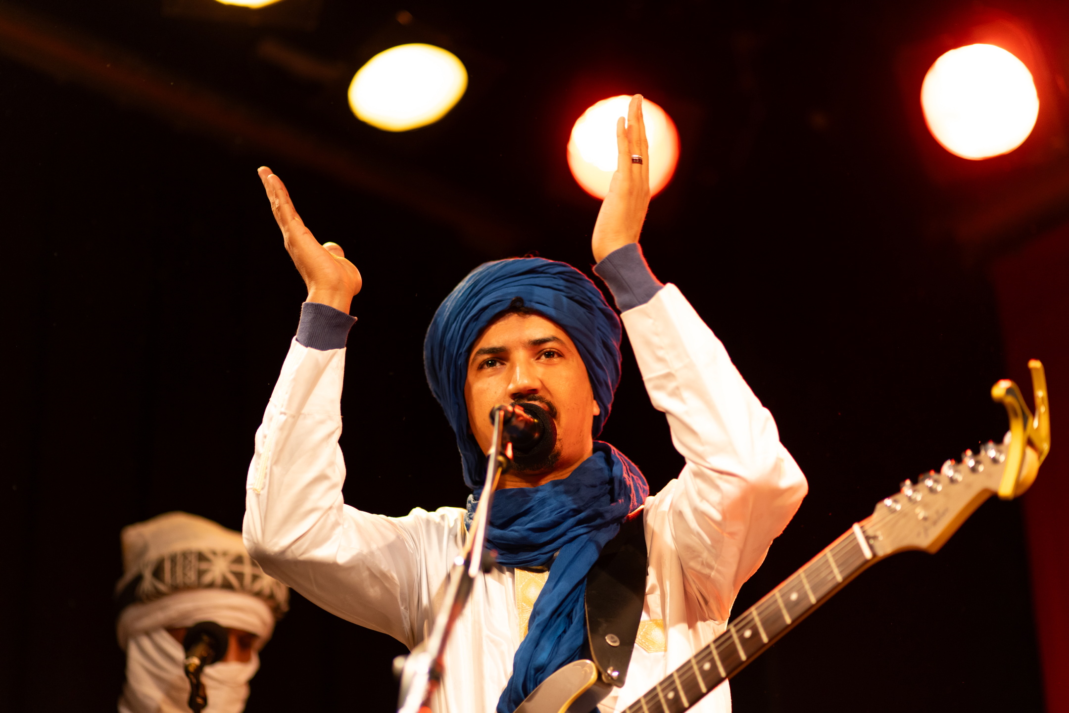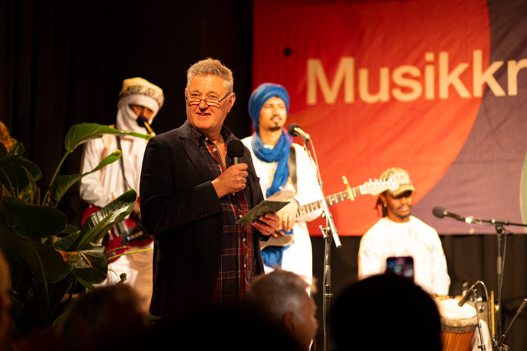 Det var ikke bare hyllesten til festivalen og musikken som var på Arne Bergs og Musikkreisens agenda. Oppmøtet i kveld blir også “premiert” med smakebiter og konsise liveintervjuer med tre av artistene som senere skal spille lengre konserter på festivalen. Først ut er Kader Tahanine Group, ledet av Kader Tahanine. Han beskrives som en av tuaregmusikkens nye perler, og er en stjerne på Sahel-regionens musikksletter.