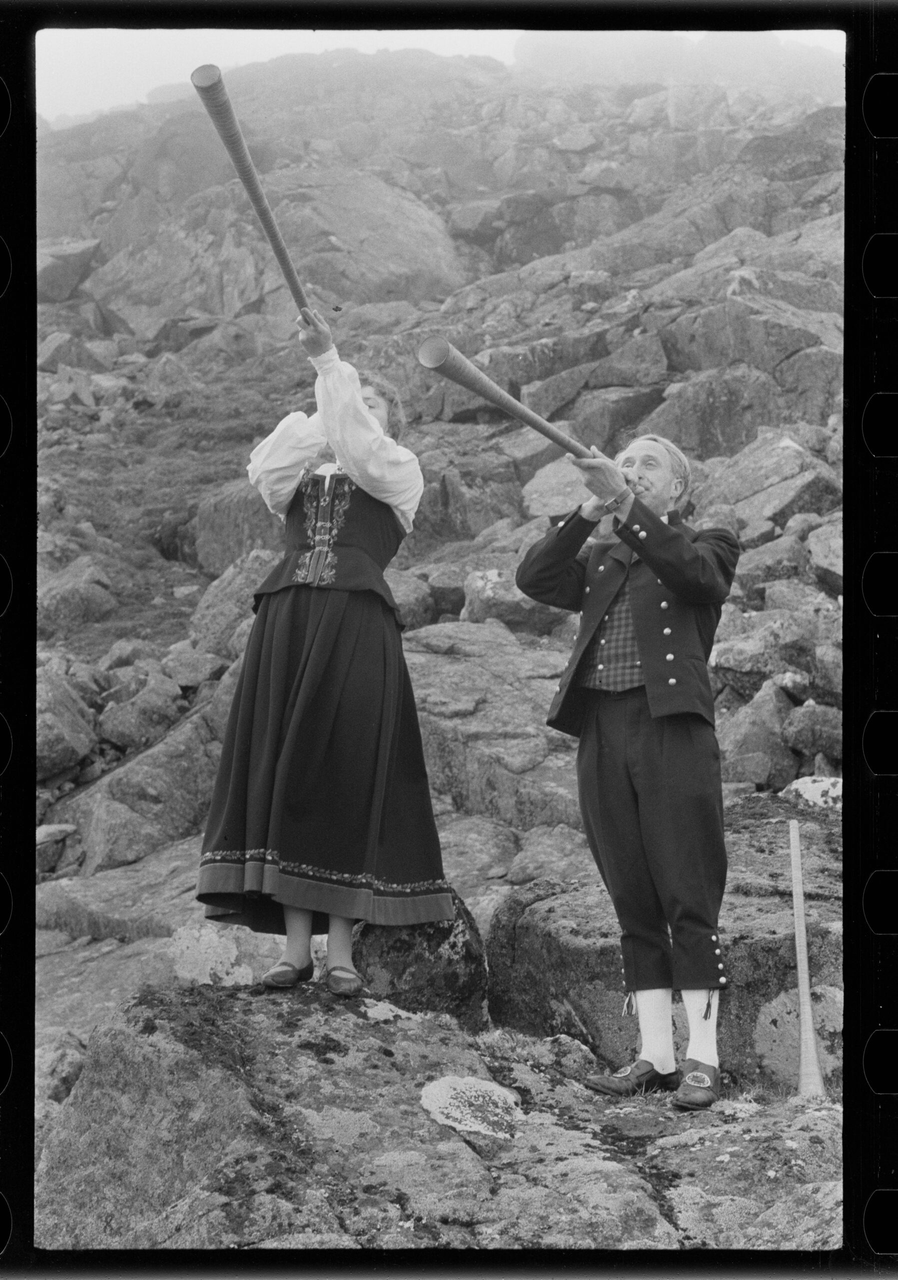 Egil Storbekken blåser i lur i Alvdal i 1963. Foto tatt i forbindelse med reportasje om den norske filmen Freske fraspark fra 1963 (Foto: Lasse Klæboe / Riksarkivet)