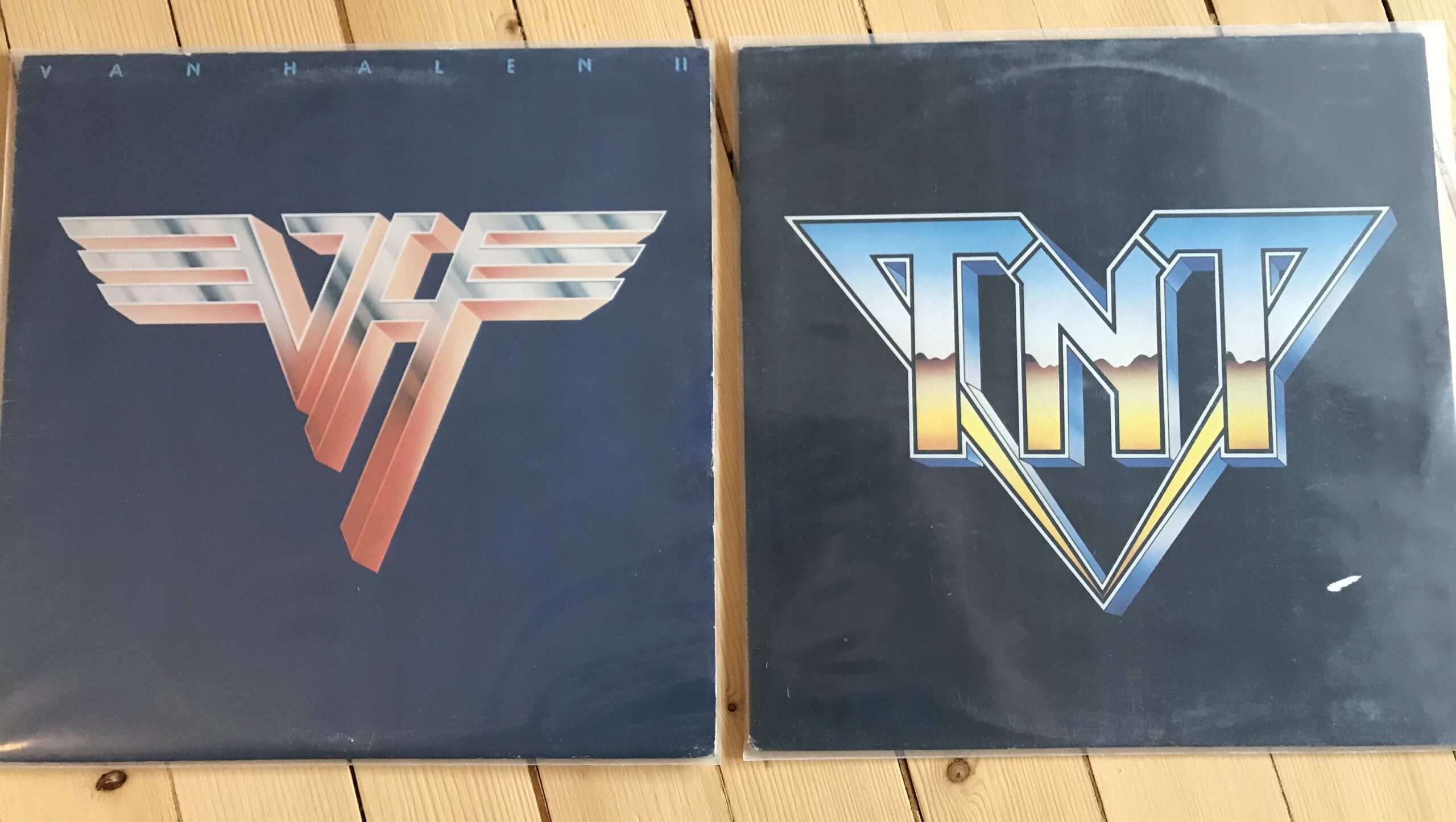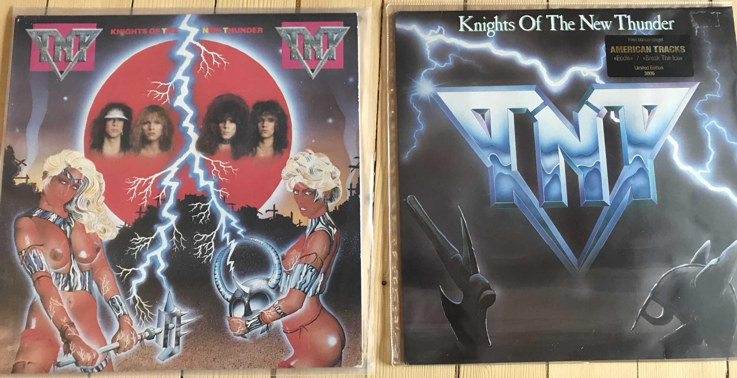 De to platecover-variantene til TNTs Knights of the New Thunder (Polygram, høst 1984). Det til høyre ble laget til USA-lanseringen. (Foto: Tore Stavlund)